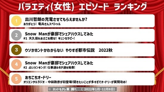 ・女性にはSnow Manの番組が人気で5位中2つでランクイン