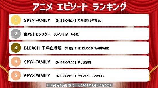 アニメでは、今年放送スタートし人気を博した「SPY×FAMILY」や「BLEACH」がランクイン。2位の「ポケットモンスター」は主人公のサトシがはじめてポケモンバトルの世界チャンピオンになったとして話題になりました。