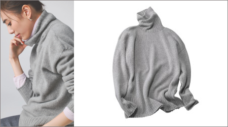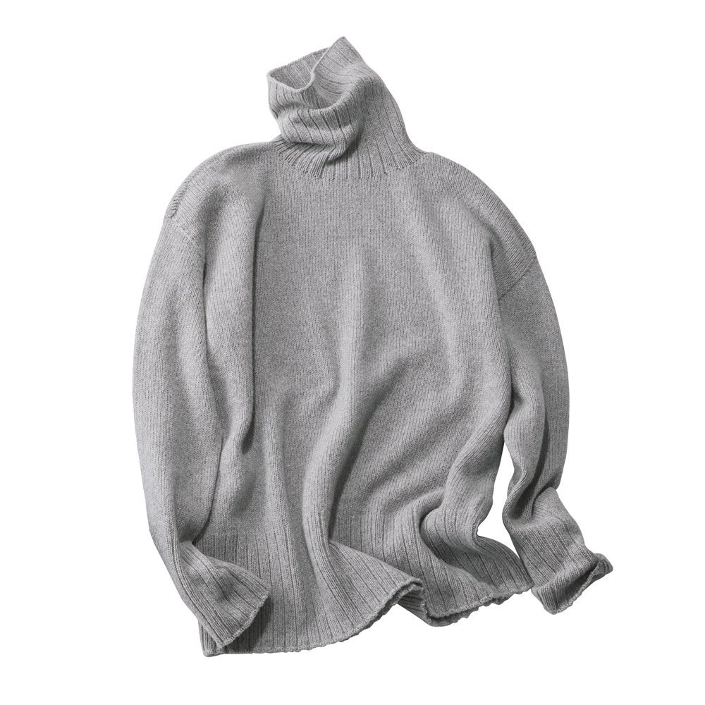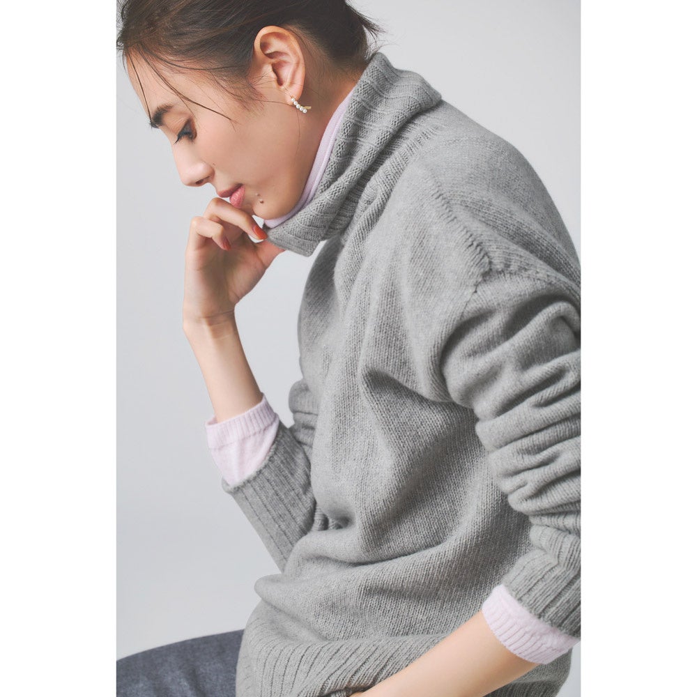 冬の着こなしに欠かせないタートルネックは、肌ざわりにこだわった「MATE」のリサイクルカシミヤ混ニットだからこその着心地を楽しめます。カジュアル感のあるミドルゲージで、シームレスに編み立てしました。落ち着いたメランジグレーも魅力です。