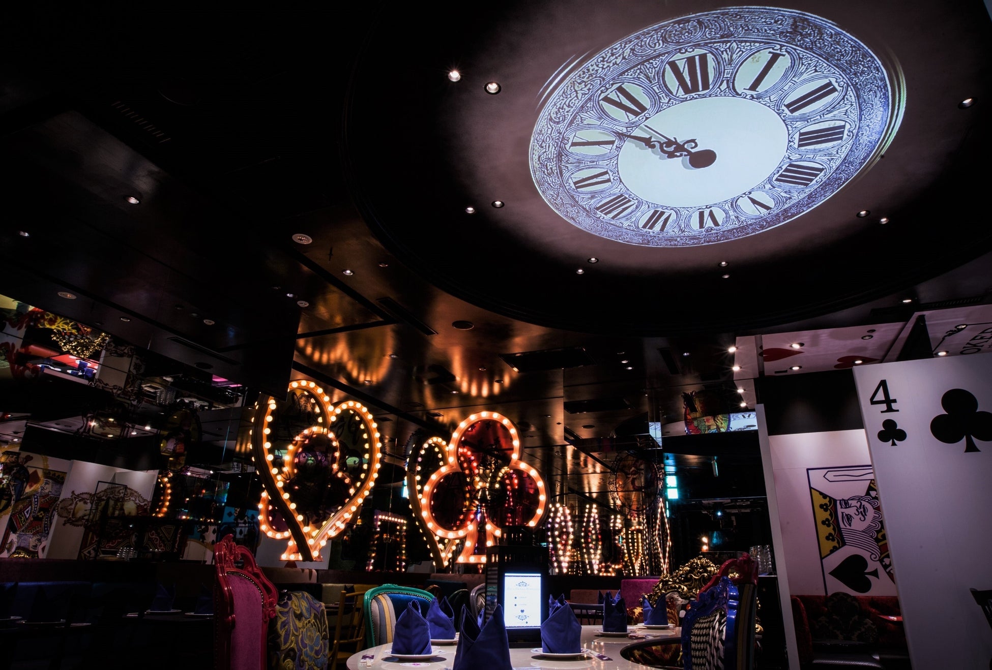 オープンフロアの天井には大きな懐中時計が浮かび、「ハートの女王」ご自慢のキラキラ光るトランプの鏡や色とりどりの玉座が並んでいます。