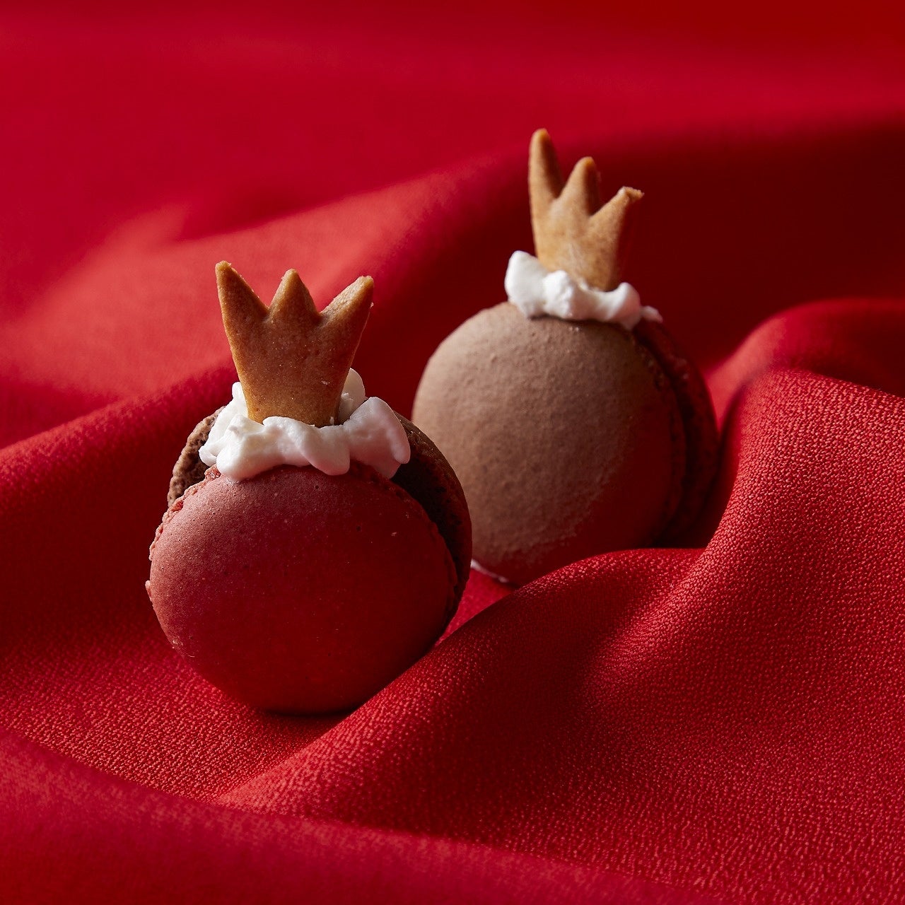 ラズベリーソースで染め上げたマカロンは、ハートの女王が愛する赤いバラを思わせる上品で華やかな一品です。一口かじると、外側のサクサクとした食感が心地よく、続いて口の中でとろける濃厚なショコラのガナッシュが贅沢に広がり、甘美なひとときを演出します。王冠を模したクッキーは、ハートの女王の栄光を象徴するかのように、優雅に飾りつけられています。