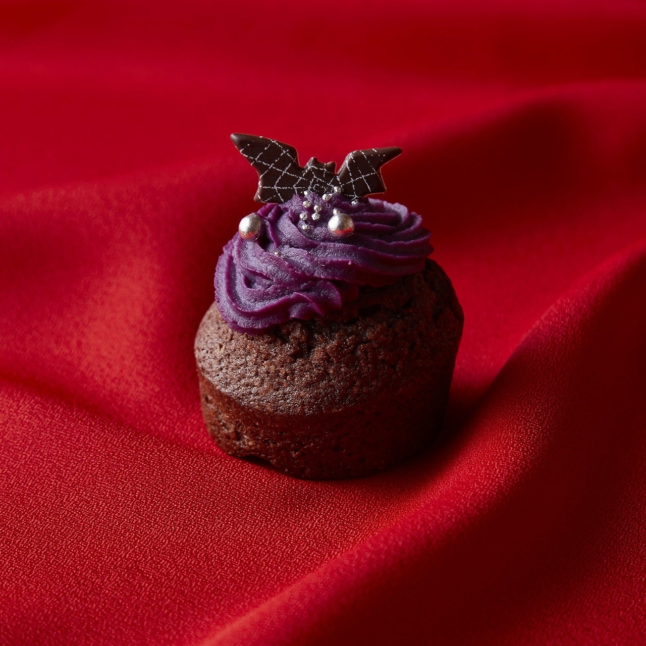 カップケーキの生地からは、ほんのりと甘い香りが漂い、しっとりとした食感が口の中で優しく溶けていきます。その上にたっぷりと盛られた紫いもクリームの、不気味さを秘めた美しい紫色がハロウィンの夜空を思わせ、コウモリが大きく羽を広げて舞い踊っているかのようです。流れ星のように輝く魅惑の宝石たちは、ハートの女王への特別な贈り物です。