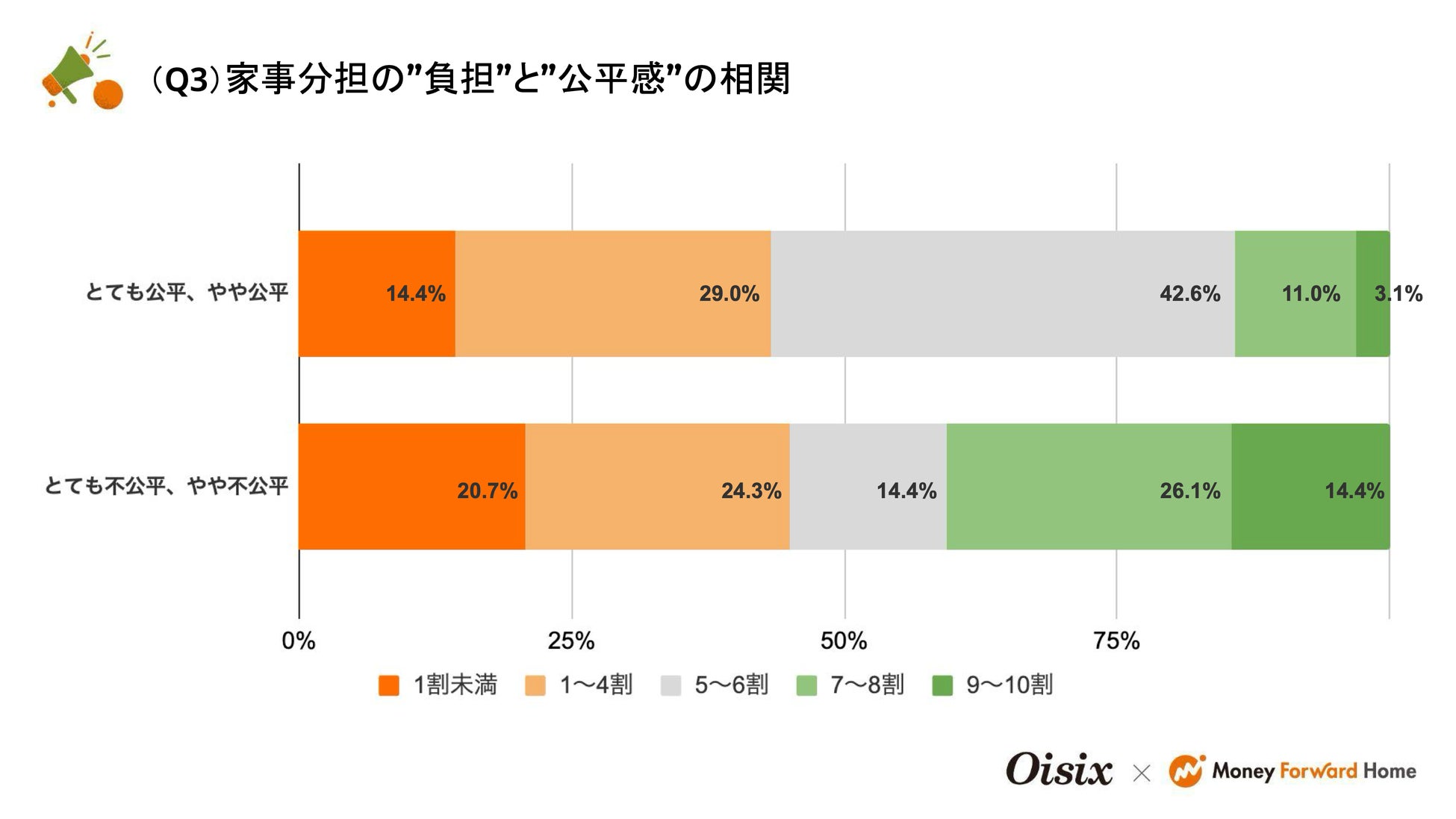 一方、「とても不公平」「やや不公平」と感じている人では、負担が軽すぎる/重すぎるという両極端に偏っている状況が明らかになりました。具体的には、自身が「1割未満」と回答した人が約21%、逆に「7割以上」負担している人が約40%となり、極端な負担状況が不公平感を抱いている人の中で大きな割合を占めました。(Q3)