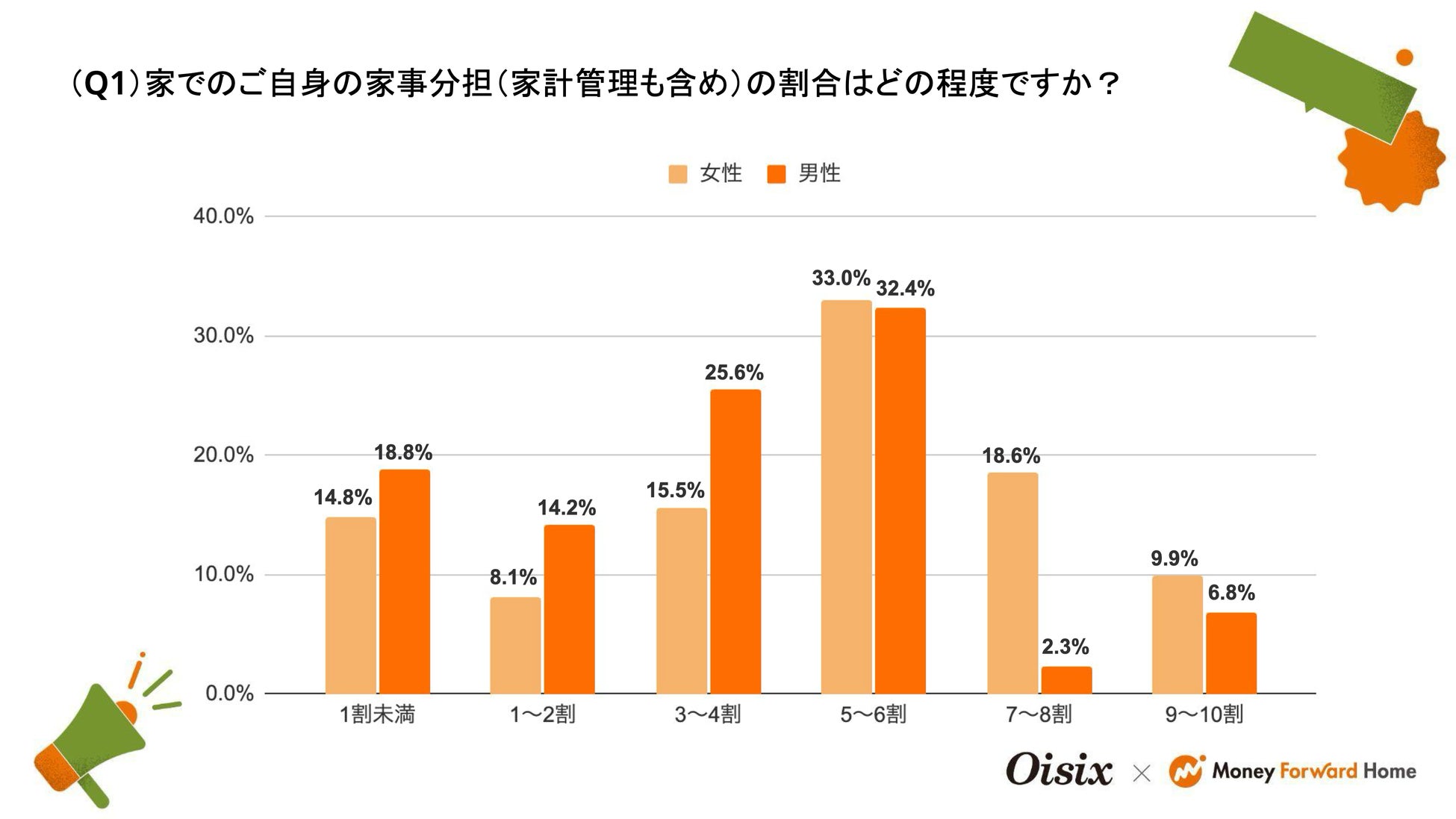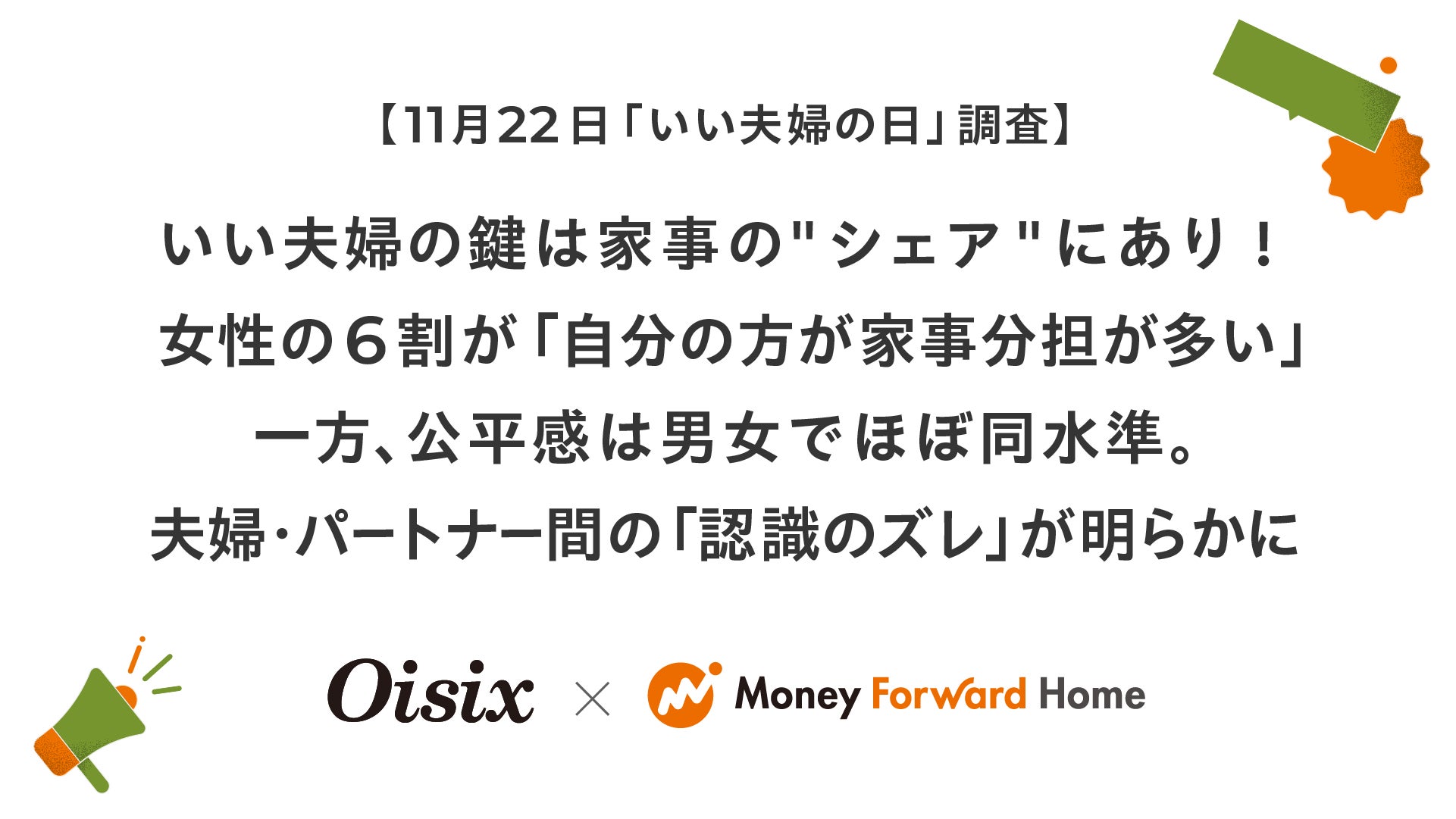 お金の見える化サービス『マネーフォワード ME』を提供するマネーフォワードホーム株式会社は、11月22日の「いい夫婦の日」に向けて、食品のサブスクリプションサービスを提供するオイシックス・ラ・大地株式会社が展開する「Oisix」と共同で、夫婦・パートナー間の家事分担に関するアンケート調査を実施しました。また、マネーフォワードホームでは、夫婦・パートナー間のお金の管理をサポートする『マネーフォワード ME』「シェアボード」機能のユーザーボイスや、ふたりで取り組める「家計のモヤモヤ解消シート」もあわせて公開しました。