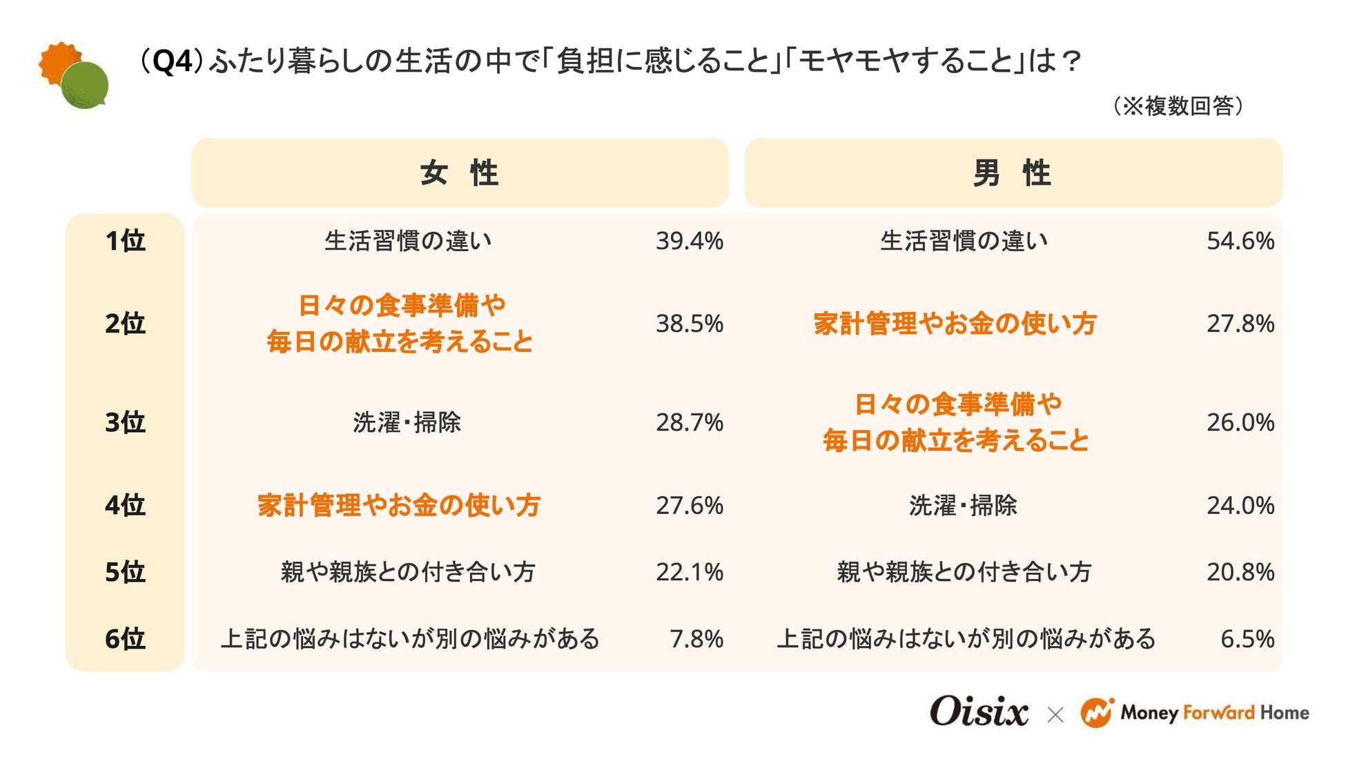 「ふたり暮らしの生活の中で『モヤモヤすること』」については、「生活習慣の違い」が男女ともに最も多く、次いで「食」や「お金」に関する項目が上位に上がりました(Q4)。