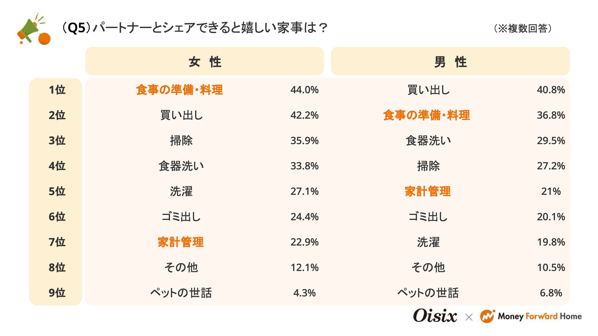 一方、「パートナーとシェアできると嬉しい家事」を見ると、「食事の準備・料理」が約4割、「家計管理」が約2割を占めており(Q5)、「食」と「お金」はモヤモヤを生みやすいテーマであるからこそ、パートナーと一緒に向き合いたいと考えている人が多いことが読み取れます。