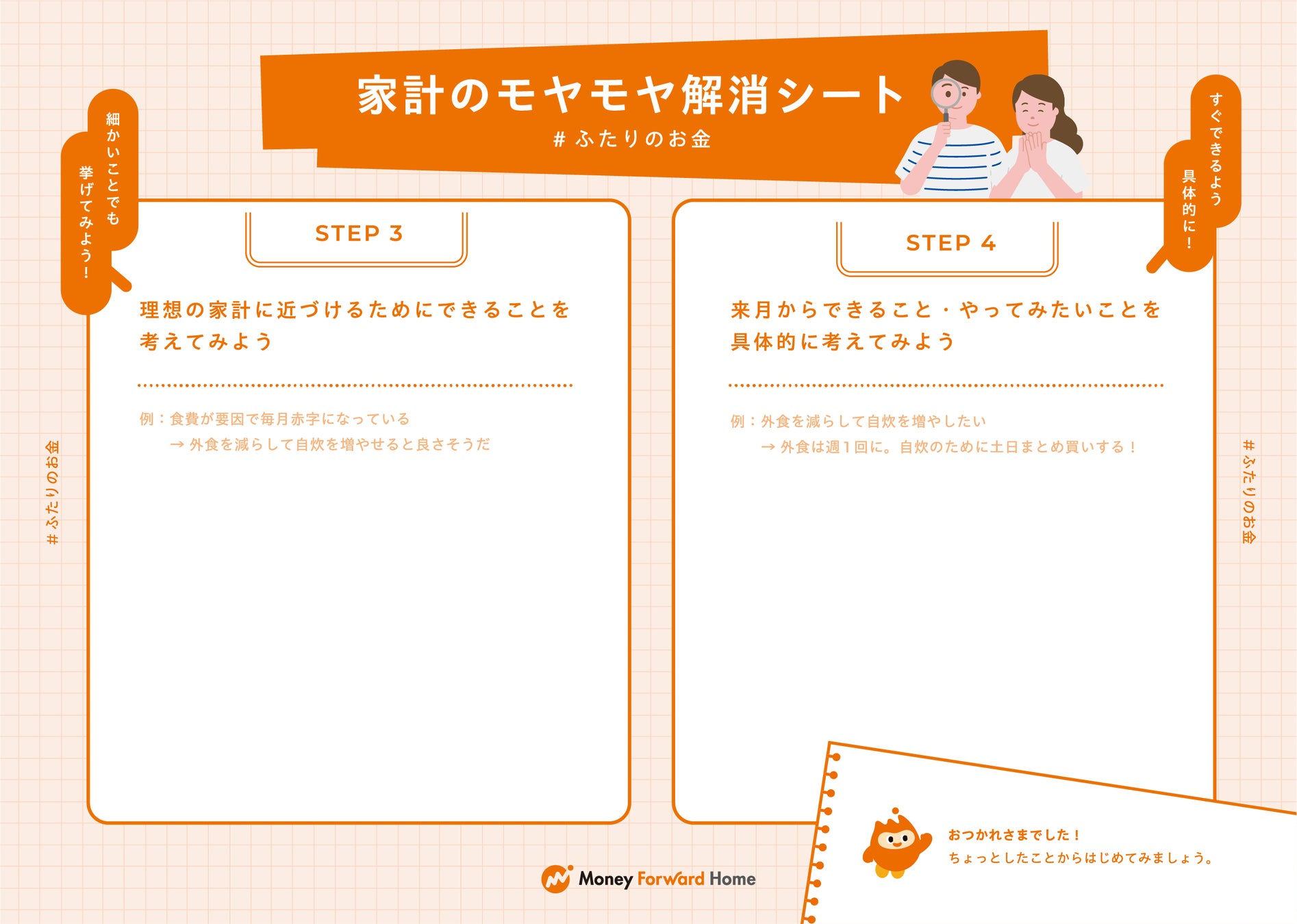 11月22日「いい夫婦の日」に向けて、『マネーフォワード ME』では、ふたりのお金の会話をサポートするワークシート「家計のモヤモヤ解消シート」を公開しました。ワークシートは以下のURLよりダウンロードできます。