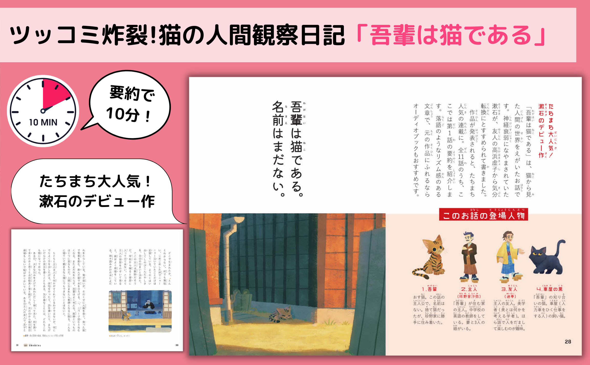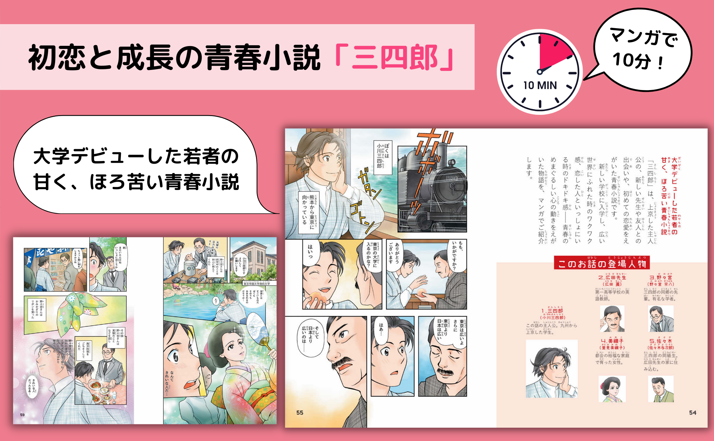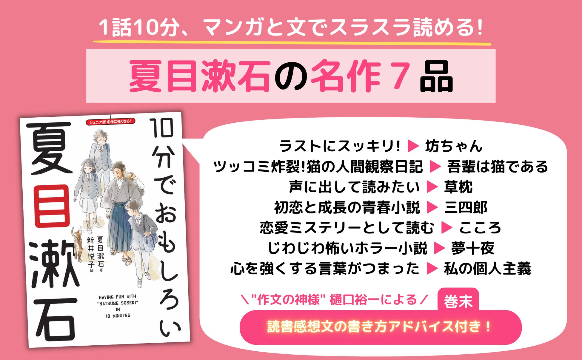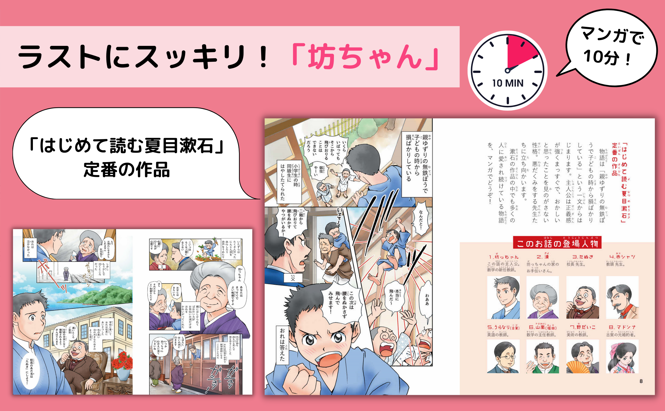子ども向けの定番「坊ちゃん」「吾輩は猫である」「こころ」「夢十夜」などを、1話10分で読めるよう、マンガと文章で再編しました。