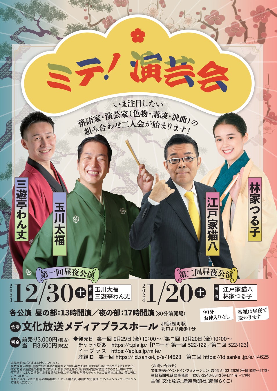 記念すべき第一回は12月30日(土)、来春15人抜きで真打ちに昇進する落語家、三遊亭わん丈と、若手浪曲師の注目株、玉川太福が出演します。第二回は来年1月20日(土)、同じく11人抜きで真打ちに昇進する落語家、林家つる子と、今年3月に襲名したばかりの動物ものまね芸、江戸家猫八が出演。歴史ある「三田落語会」の会場である、文化放送メディアプラスホールを盛り上げます。