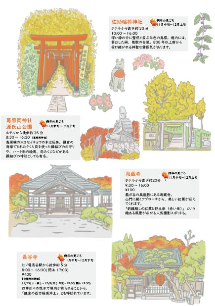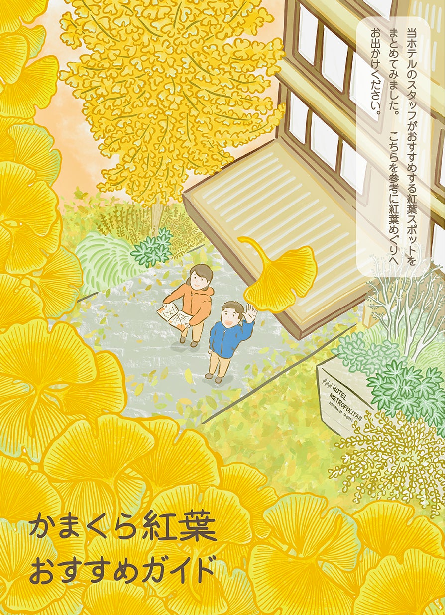 ホテルメトロポリタン 鎌倉(運営/日本ホテル株式会社、 総支配人/草野 博子)は、ホテルスタッフがおすすめする紅葉スポットをまとめた「かまくら紅葉おすすめガイド」を作成しました。鎌倉らしいメジャーなスポットからひっそりとした裏通りのスポットなど全16のスポットを紹介する冊子です。冊子内のイラストは、鎌倉で活動をしているイラストレーター“ほりはる”さんに依頼をし、すべてのイラストは今回のために書き下ろしていただきました。作品は柔らかな線画が特長で、見る方の気持ちが温かくなるような仕上がりです。こちらの冊子は紅葉シーズン期間中、ご宿泊者さまをメインに無料で配布いたします。