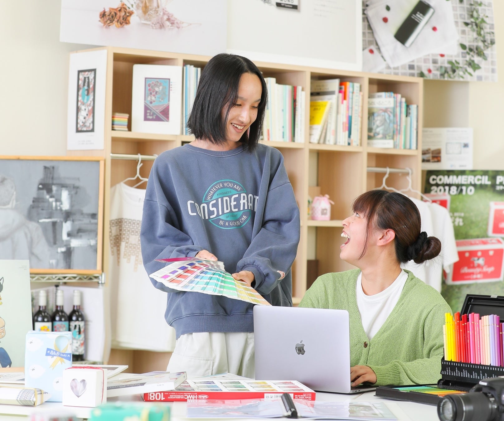 デザインの基礎を幅広く学び、企業連携でのデザイン制作などの実践授業を通じて、デザイナー・webデザイナーのプロを目指す学科です。