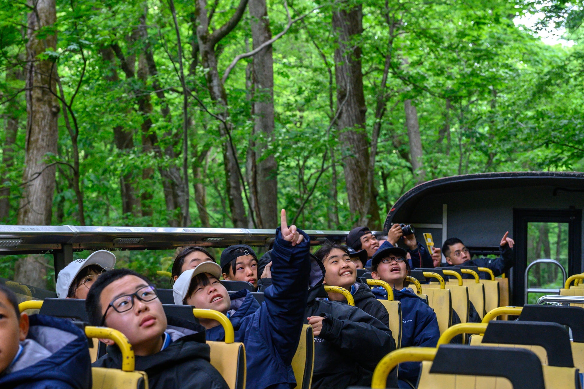 続いて生徒たちは、奥入瀬渓流ホテルのアクティビティ「渓流オープンバスツアー」に参加しました。このツアーは、屋根のない開放的なバスに乗車し、奥入瀬渓流の自然を普段とは異なる蝶や鳥の視点から観察できるプログラムです。頭上を覆うように広がる鮮やかな新緑の木々や、渓流沿いに続く美しい景色を、渓流コンシェルジュの解説に耳を傾けながら満喫。渓流オープンバスから見上げるダイナミックな自然の姿に、生徒たちは驚きと新たな発見を得ていました。