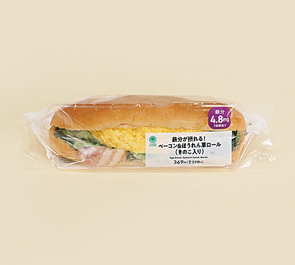 このたび、日本人の鉄分不足に対応し、手軽においしく鉄分4.8mgが摂れる「鉄分が摂れる!ベーコン&ほうれん草ロール」を発売いたします。たっぷりのほうれん草と香ばしいベーコン、さらに数種類のきのこを挟み、鉄分量だけでなく、おいしさにもこだわったロールサンドをぜひこの機会にお楽しみください。