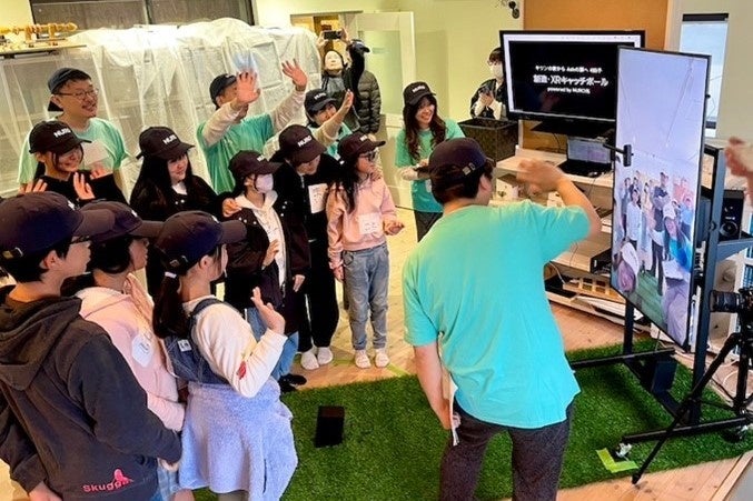今回のイベントでは、ソニーグループ株式会社のデザイン部門であるクリエイティブセンターが開発した、仮想のボールをやりとりする「XRキャッチボール」(※2)を用い、約600kmの距離が離れた福岡-大阪間で、子ども達にバーチャルのキャッチボール体験を提供。
