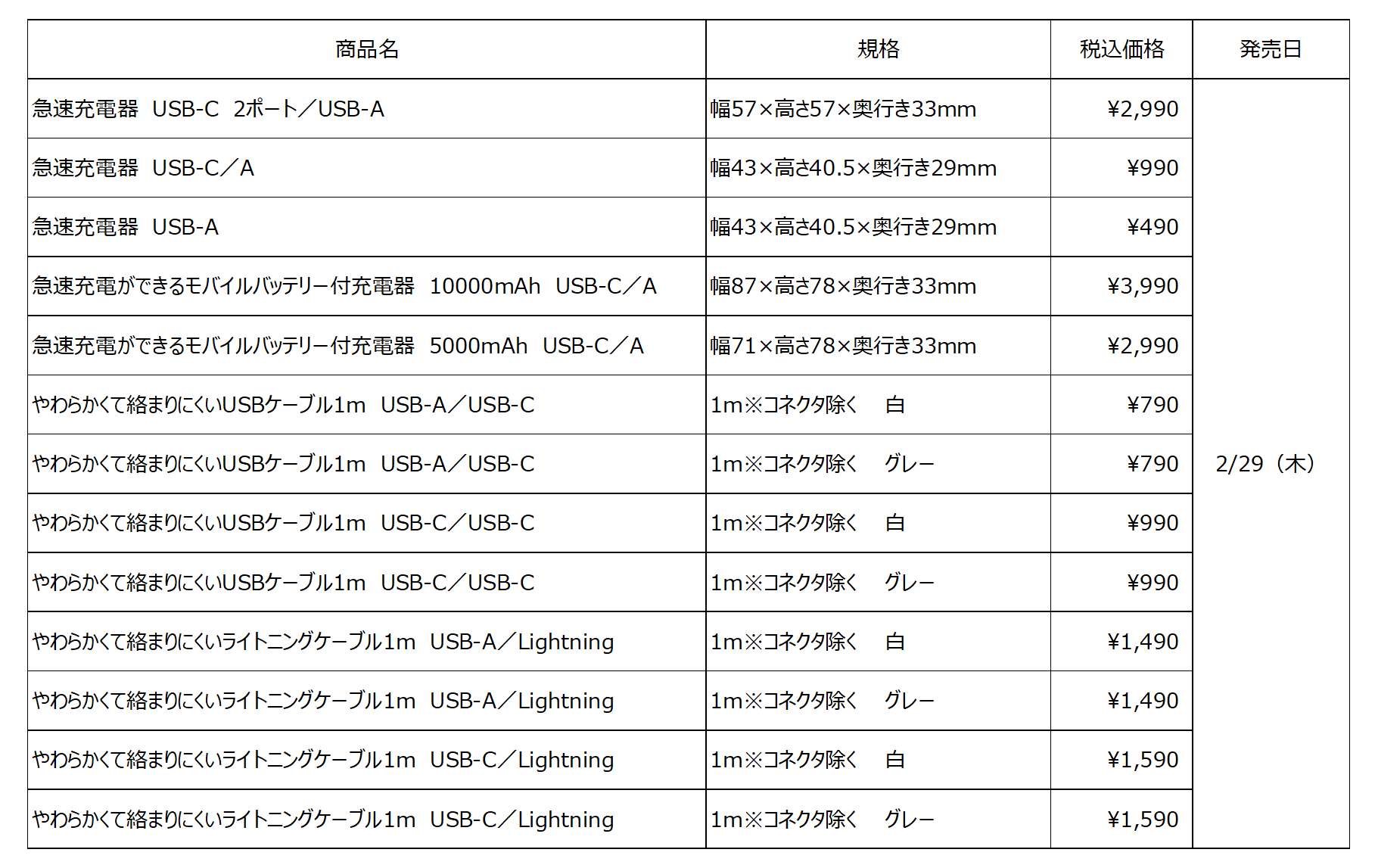 2/29(木)無印良品 急速充電器5種とUSBケーブル8種 新発売のお知らせ