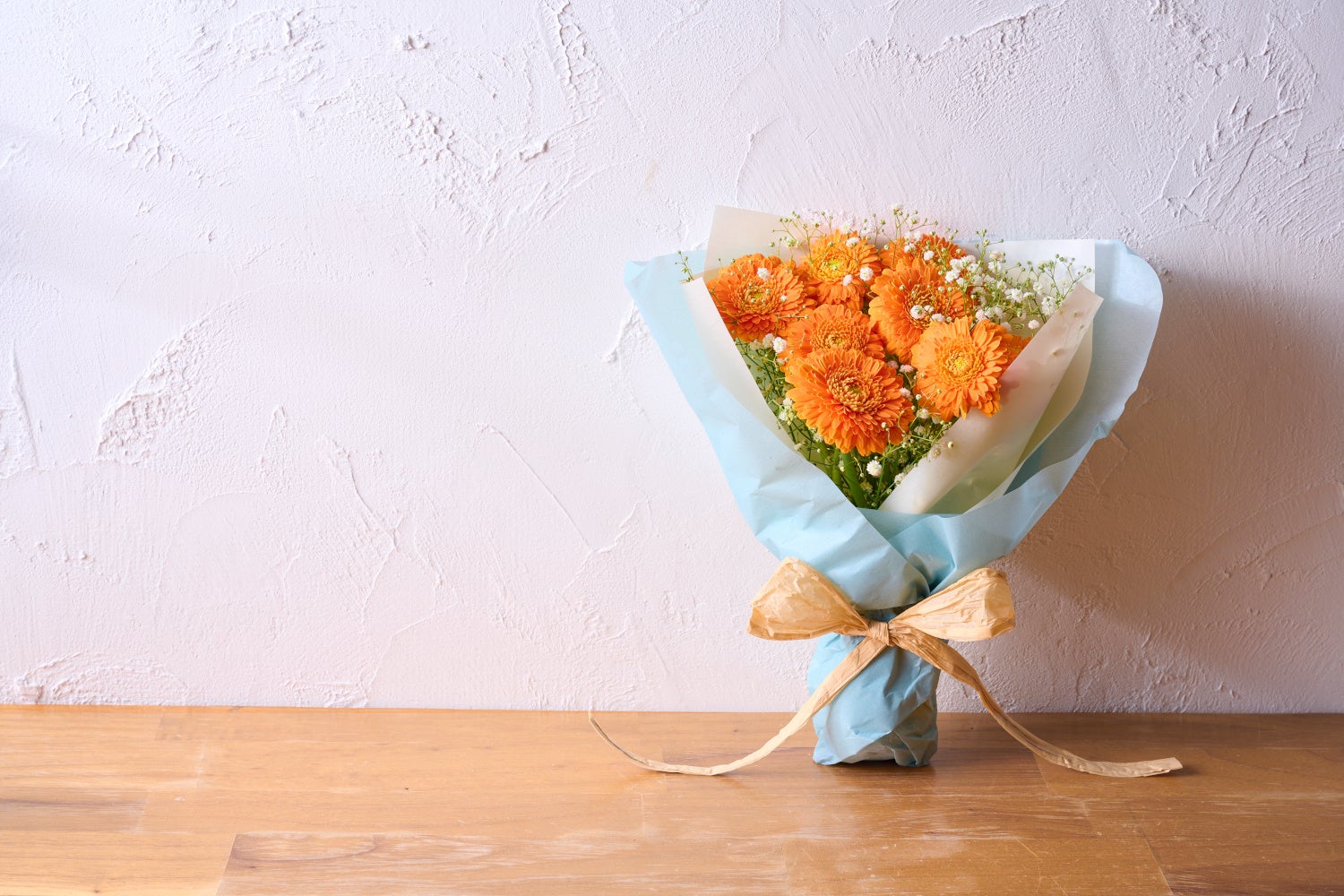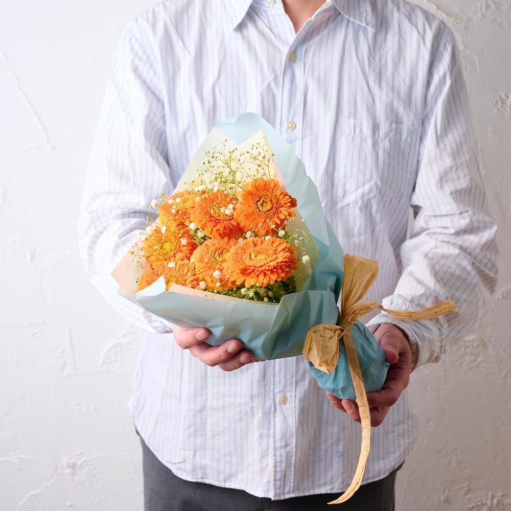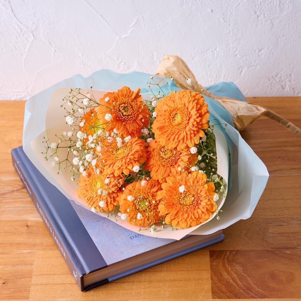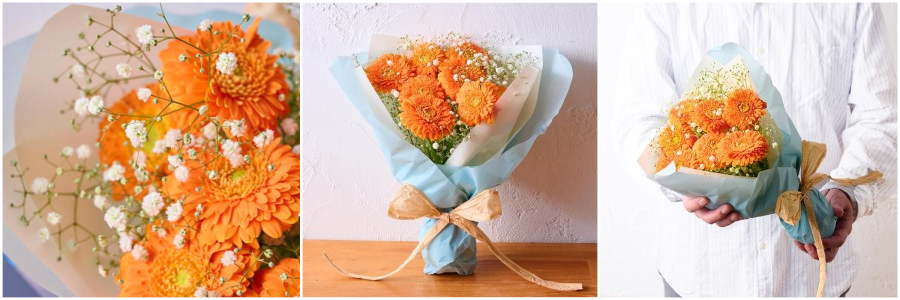 オレンジ色のガーベラは、花言葉のひとつに「あなたは私の輝く太陽」という説があり、大切な仲間や同僚、チームメイトへの贈り物としてもおすすめです。