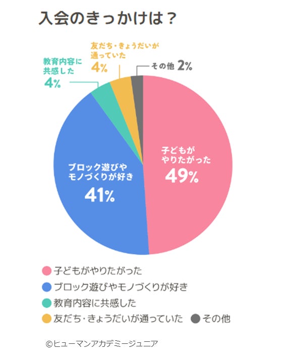 また、入会のきっかけは49%が「子どもがやりたいと言った」、40%が「子どもがブロック・ものづくりが好き」と二分する結果となり、親が子どもの希望や適性を見てとり、子どもにすすめる事例も半数近く見られました。ロボット教室に通ってから身についた力は「創造力」「集中力」「空間認識力」など、認知能力だけではなく非認知能力も含めた様々な力を伸ばせたと実感されていました。
