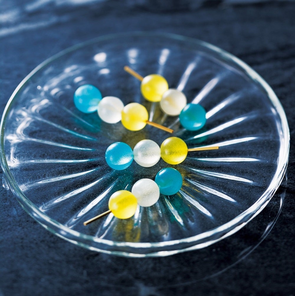 夏の風情をきらめく彩に宿した、寒天製のお菓子。弾力ある食感と3つの風味を楽しんで。