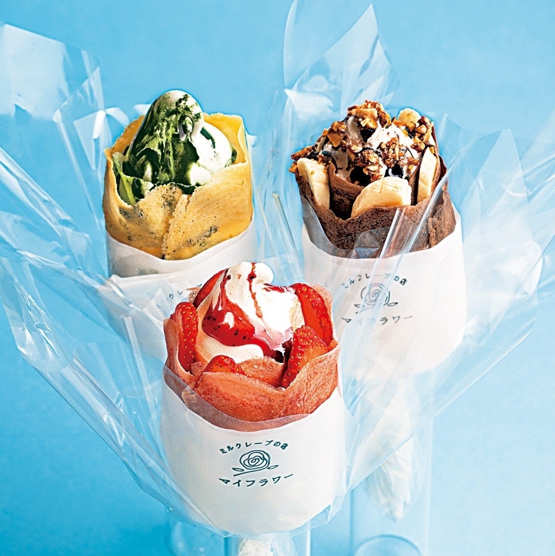 関東初出店のミルクレープ専門店。ミルクレープにソフトクリームを添えた、ブーケのような華やかなオリジナルスイーツ。〈通期・初登場・実演〉