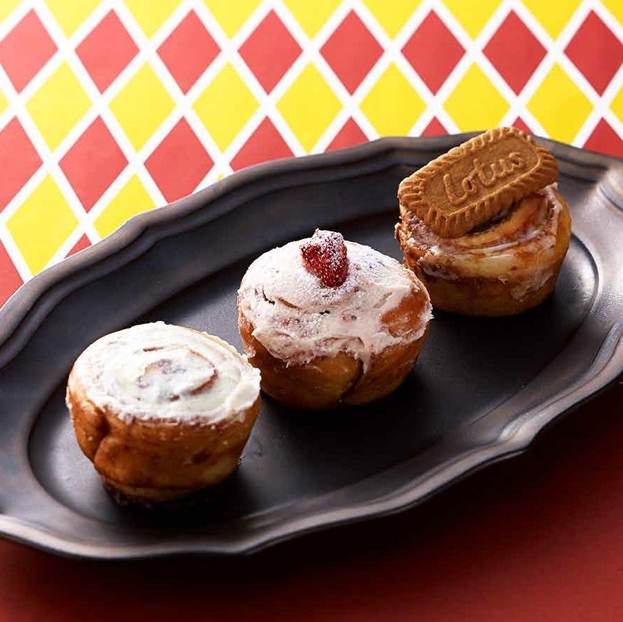 クリームチーズやいちごクリーム、キャラメルソースの個性豊かなシナモンロール。〈通期・初登場〉