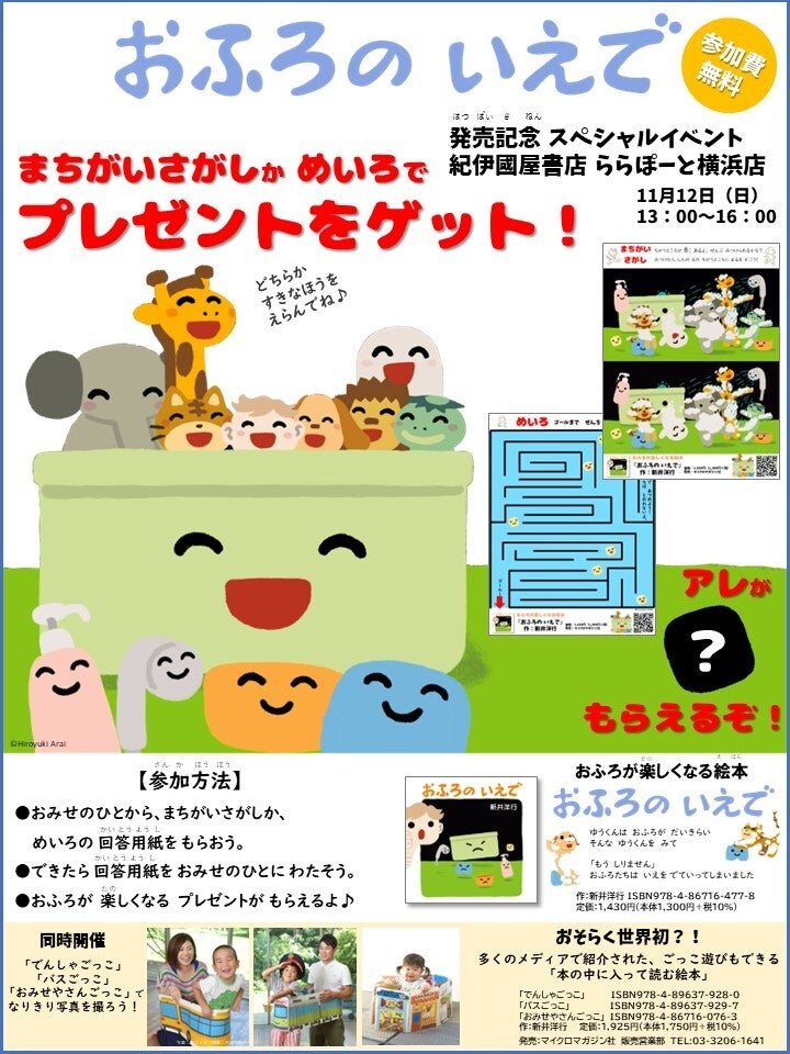 新井洋行先生の新作絵本『おふろの いえで』の発売を記念したスペシャルイベントを、11月12日(日)に紀伊國屋書店ららぽーと横浜店にて開催いたします。