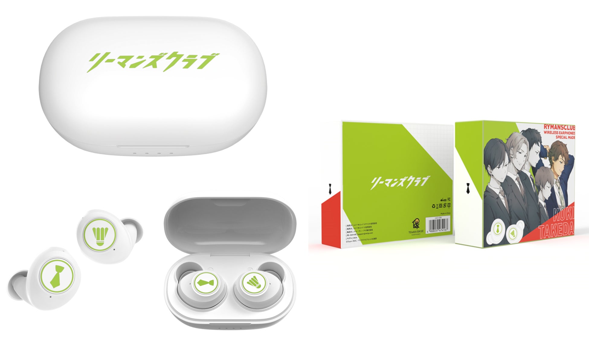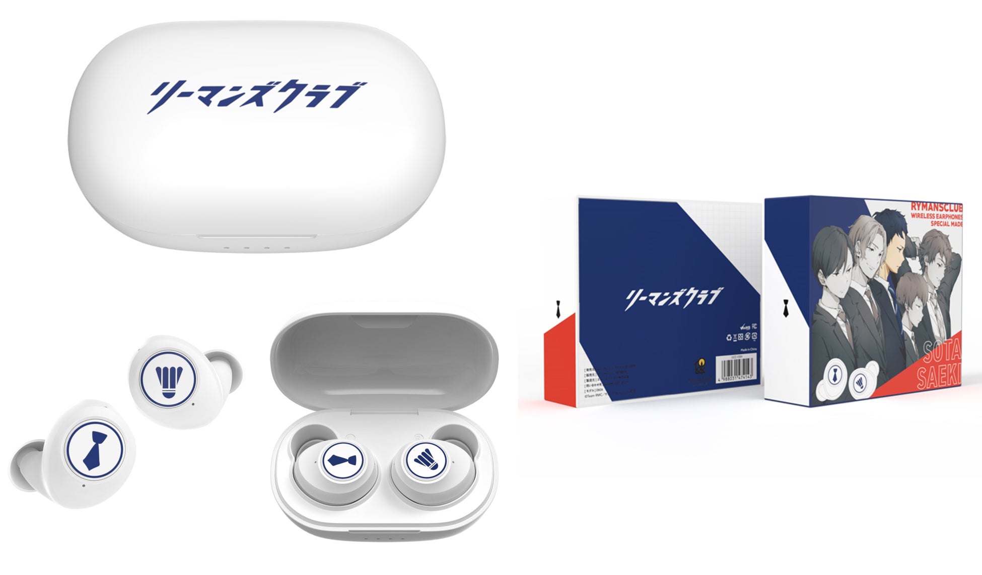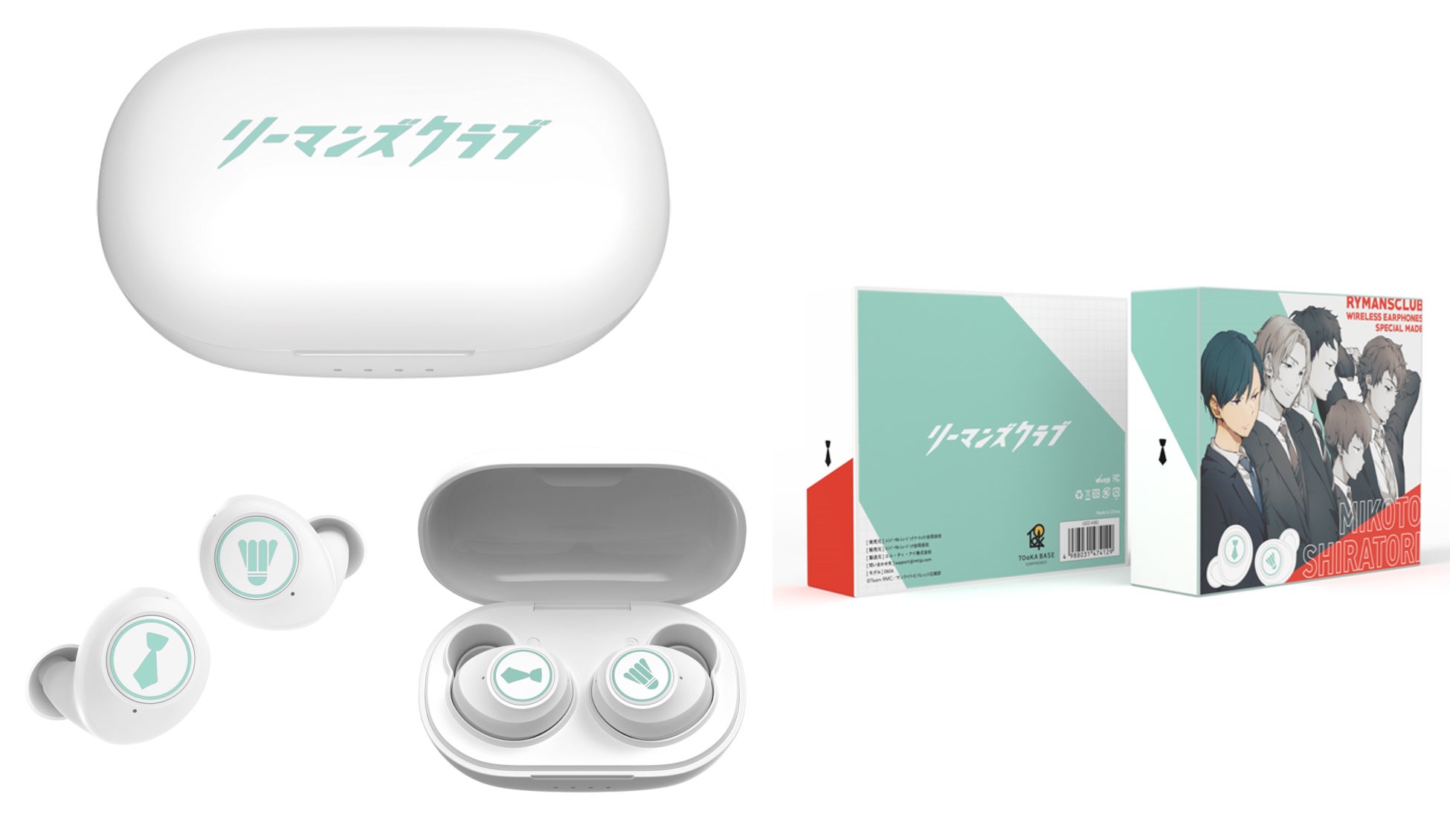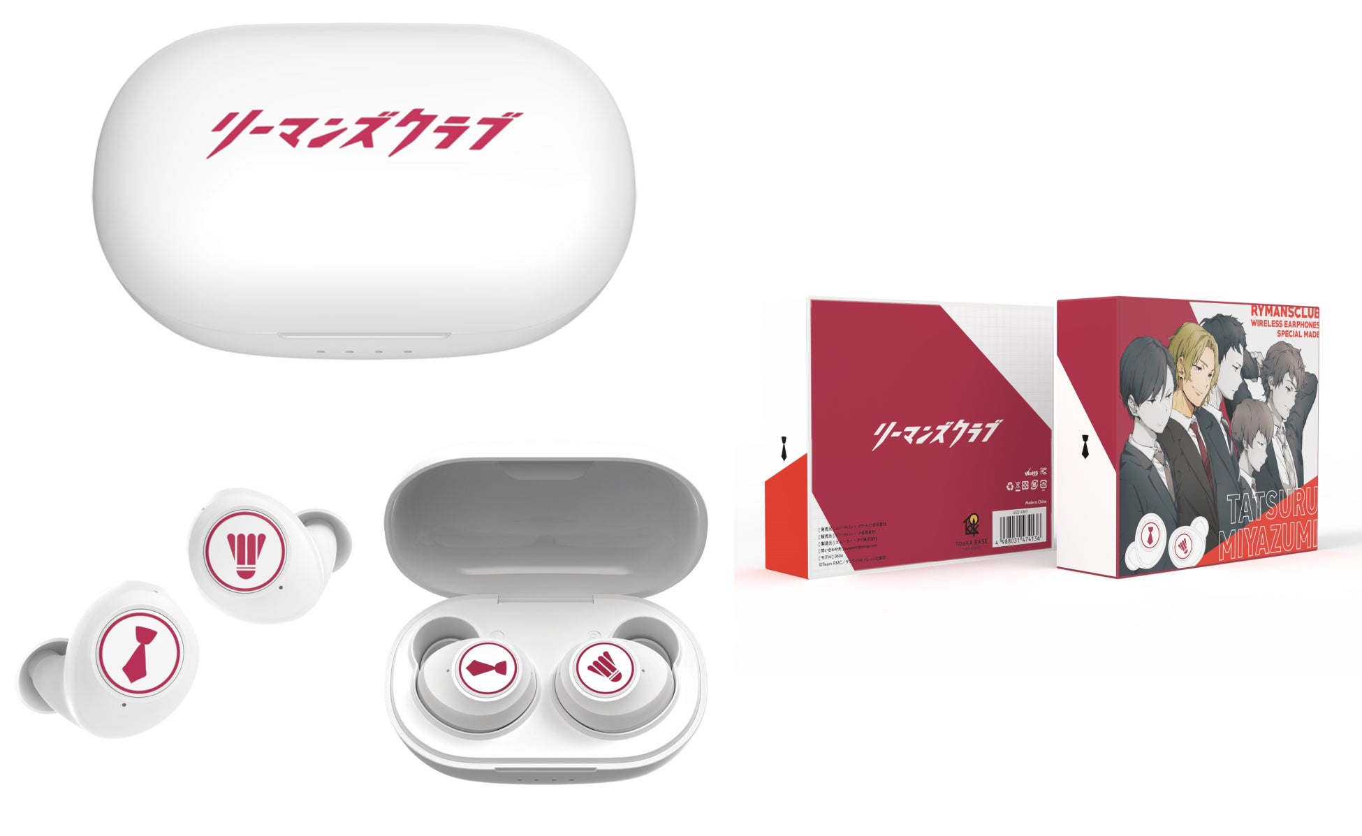 ケースは白地に各キャラクターのイメージカラーが映え、イヤホン左右にはバドミントンのシャトルとサラリーマンの象徴・ネクタイがあしらわれた、作品の世界観を感じられるアイテムです。