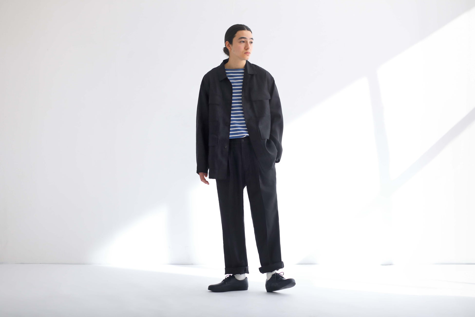 縦糸に天然素材のヘンプ、横糸にレーヨンやポリエステルを使うことで、天然素材の持つ自然な風合いは残しながらシワになりにくい生地にしています。また、光沢感のあるなめらかな肌触りの生地できれいめなカジュアルコーディネイトを提案します。