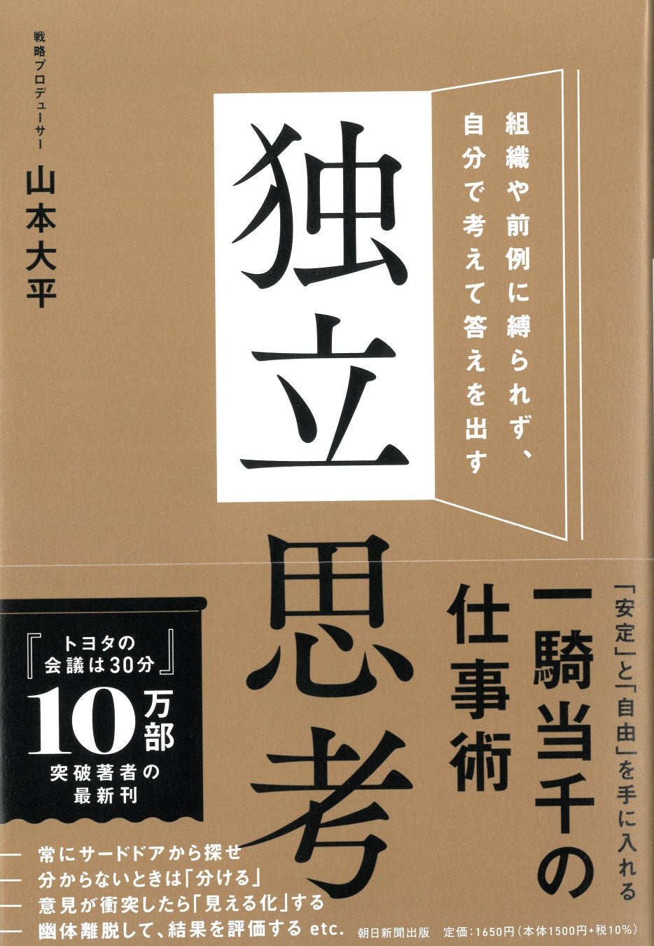 30年以上停滞を続ける日本経済――そこに2020年からのコロナ禍という全世界的な衝撃によって、仕事で求められる能力や働き方、評価軸は大きく変わりました。年功序列や生涯一社という今までの「当たり前」が崩壊していく中、必須となるのが「自分の頭でアイデアを考えて行動に移す」仕事術です。本書では、このスキルを身につけるための考え方を「独立思考」と名付け、47のポイントに分けて解説しています。著者の山本氏がトヨタ自動車・TBS・アクセンチュアを経て、現在は事業経営をする中で掴んだ「現地現物の思考法と行動原則」を惜しみなく、この一冊に凝縮しました。