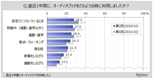 直近1年間にオーディオブックを利用した人の利用場面は(複数回答)、「自宅でくつろいでいるとき」「移動中(通勤・通学以外)」が各3割弱、「通勤・通学」「散歩、ウォーキング」が24~25%です。