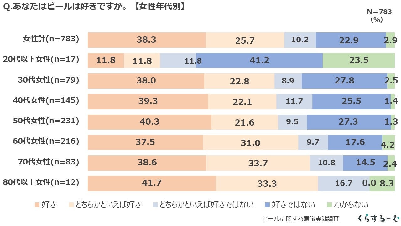 ビールについて好き嫌いを尋ねたところ、男性では61.7%、女性は38.3%が「好き」と回答しました。「どちらかといえば好き」と合わせて、ビールが好きな人は男性で86.3%、女性で64.0%と、ビールは男性の方が好きな傾向となりました。年代別にみてみると、年代が下がるについてビール好きの割合が減り、特に女性ではビール嫌いの割合が約4分の1を占めるようになっています。