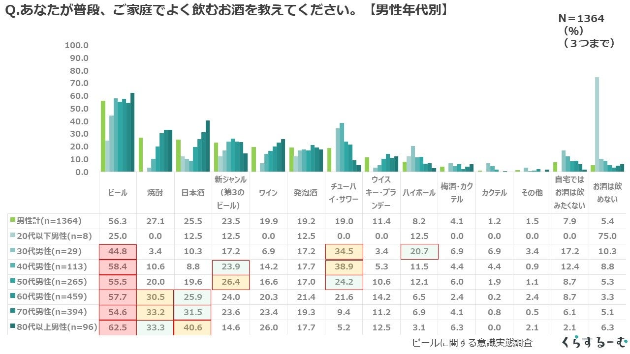 家庭でよく飲むお酒について聞いたところ(複数回答3つまで)、「ビール」と回答した人は男性で56.3%、女性で45.8%となり、トップでした。発泡酒は男性で19.2%、女性で17.0%、新ジャンルは男性で23.5%、女性で14.4%を占め、50代男性で2位(26.4%)、40代男性で3位(23.9%)となっています。男性は「焼酎」「日本酒」が年代が上がると高く、年代が下がると「チューハイ・サワー」が増え、女性でも年代が下がると「チューハイ・サワー」が好まれる傾向となっています。