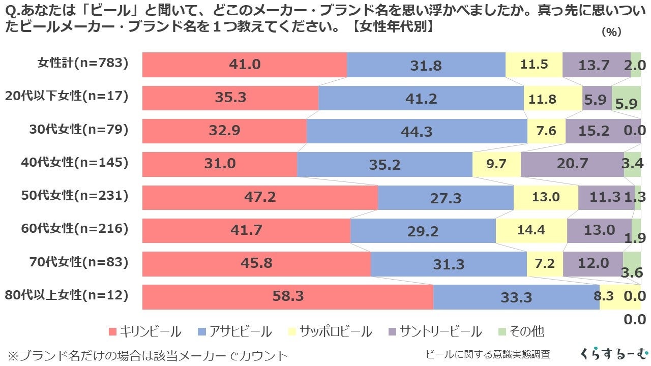 シニア「キリン」、40代以下では「アサヒ」、「サッポロ」は男性、「サントリー」は女性