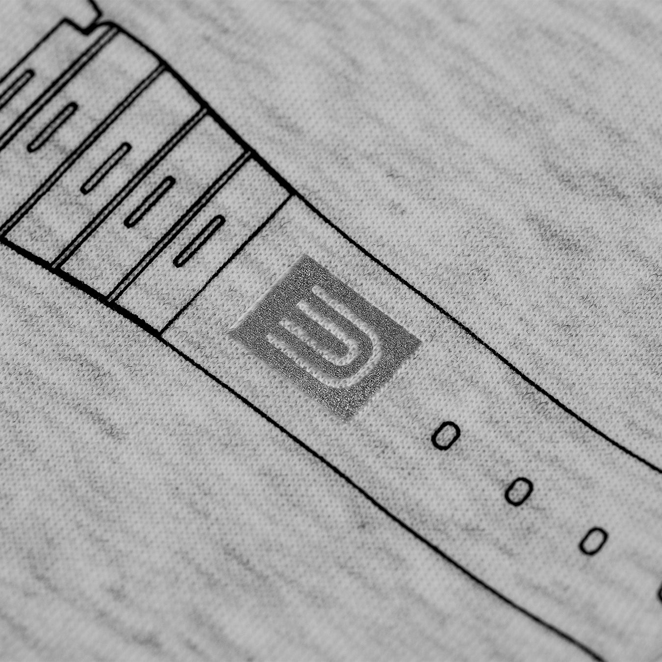 袖にプリントされた時計のストラップ部分にあるユニバーサルオーバーオールのロゴが実はリフレクター素材になっています。夜道や暗所などでここに光が当たると反射するため、ワンポイントながらキャンプや日常の着用時に役立ってくれます。