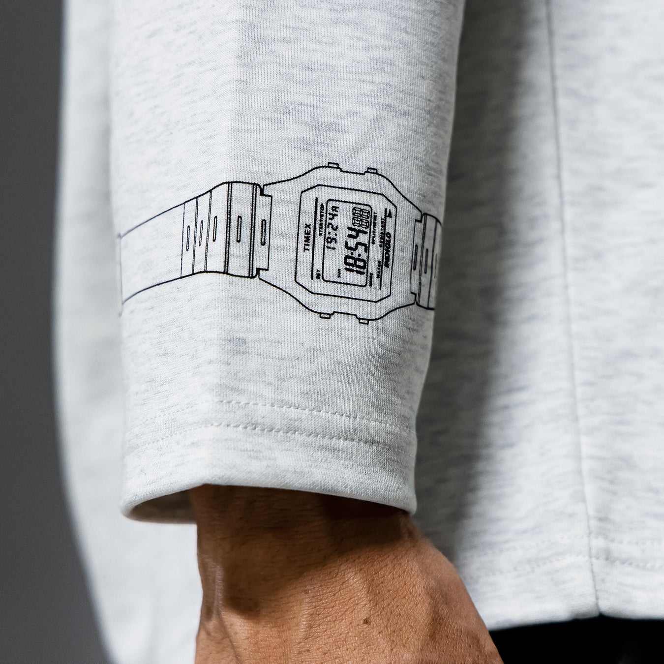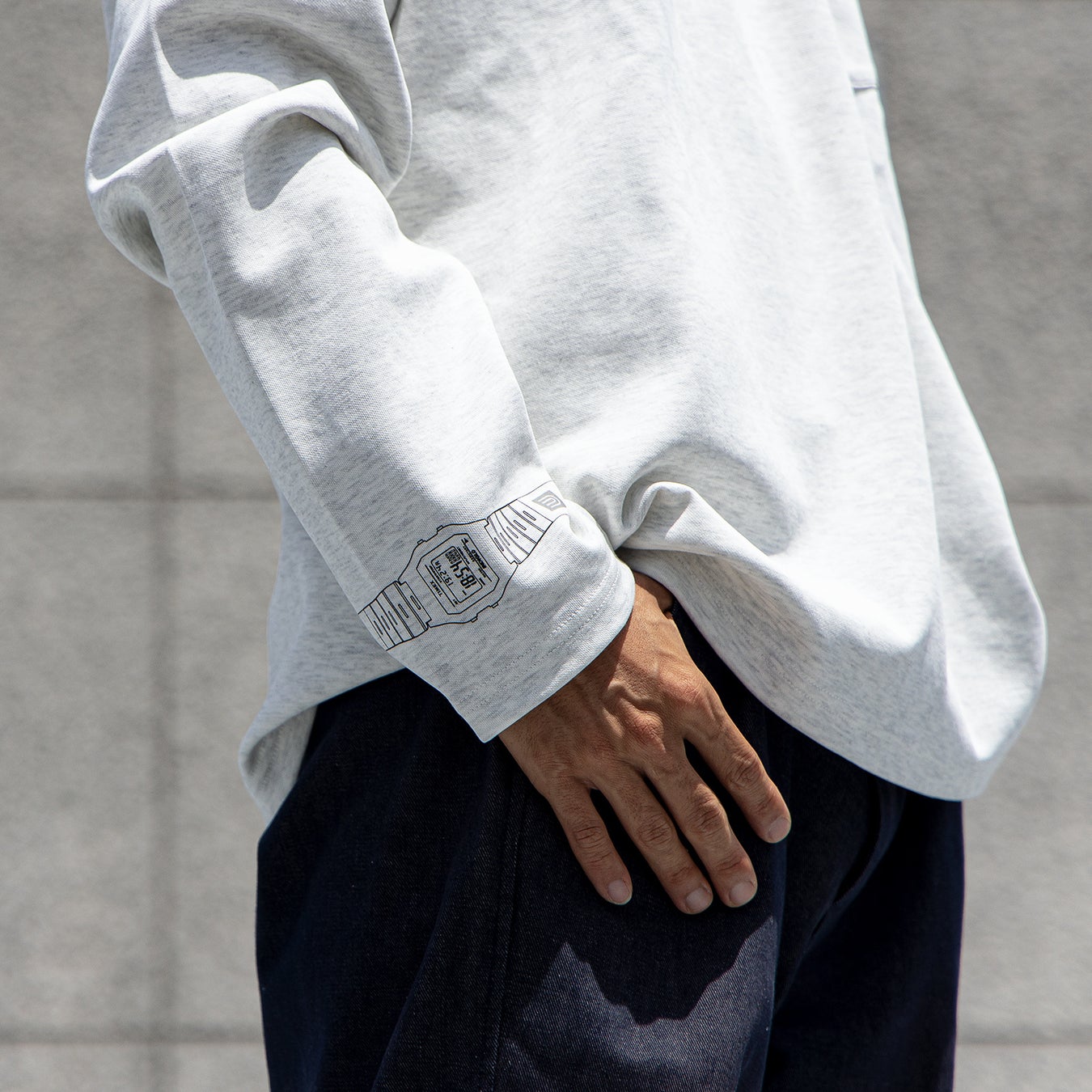 ユニバーサルオーバーオール謹製の綿100%ボディのやや肉厚なオートミールカラーのロングスリーブTシャツをベースに、タイメックスとのコラボレーションによるスペシャルなディテールが盛り込まれています。