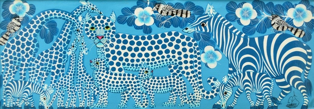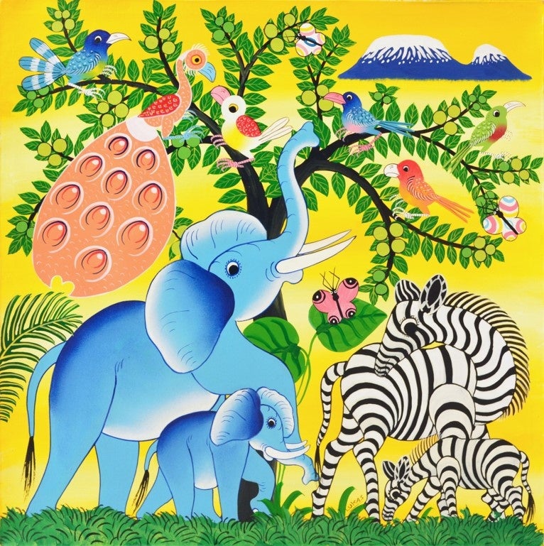 タンザニアの豊かな自然、動物、人々の暮らしを、たった6色のペンキから色鮮やかに、下描きをせずのびのびと描くダイナミックな絵画を展開。