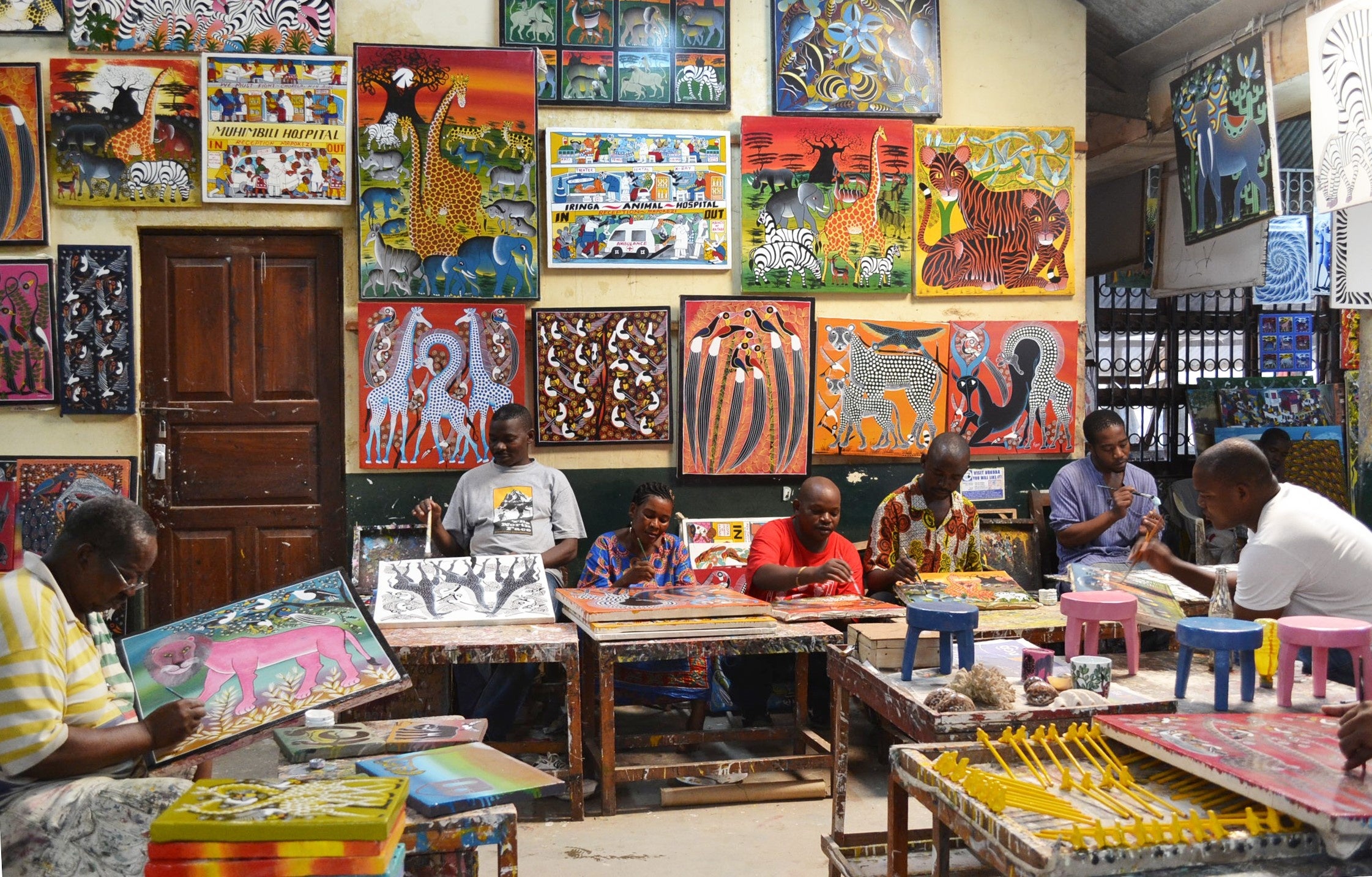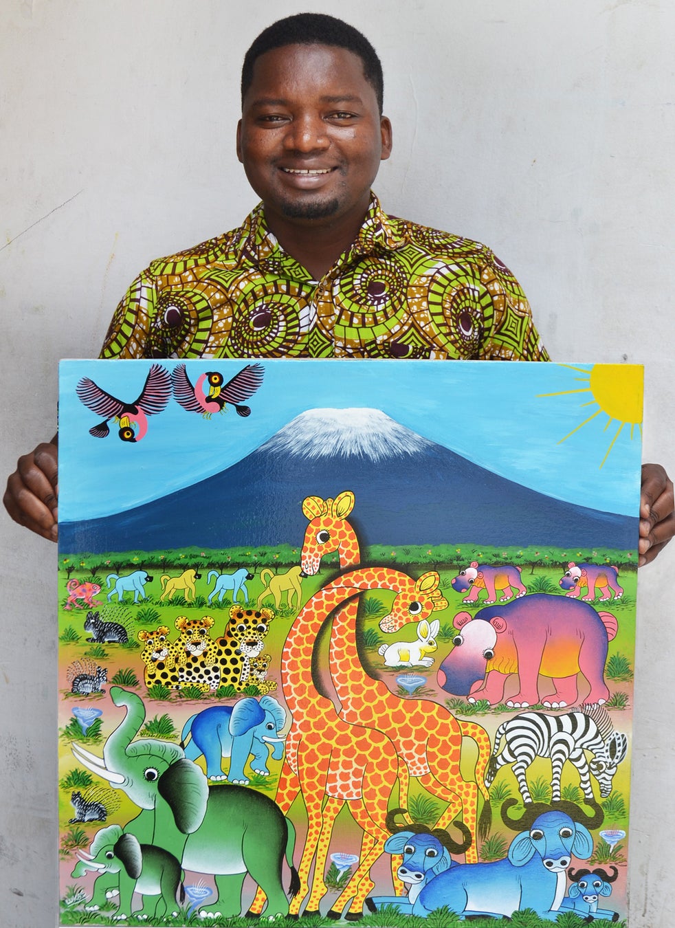 「私は、小学校しか行っていないけれど、ティンガティンガ・アーティストとして誇りを持って生きています。父から習ったオーソドックスタイプと、自分らしさを前面に出した作風の二つを描き分けています。ゾウやキリン、鳥などは、描き方が幾通りもあるんですよ」