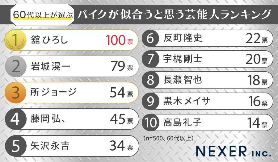 ということで「60代以上が選ぶバイクが似合うと思う芸能人ランキング」は、以下のようになりました!