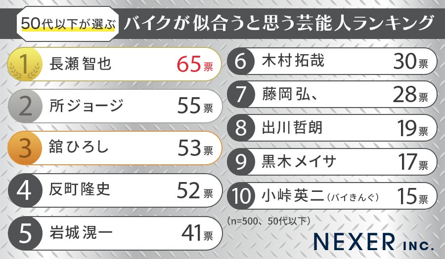 まずは「50代以下が選ぶバイクが似合うと思う芸能人ランキング」を理由とともに発表します。