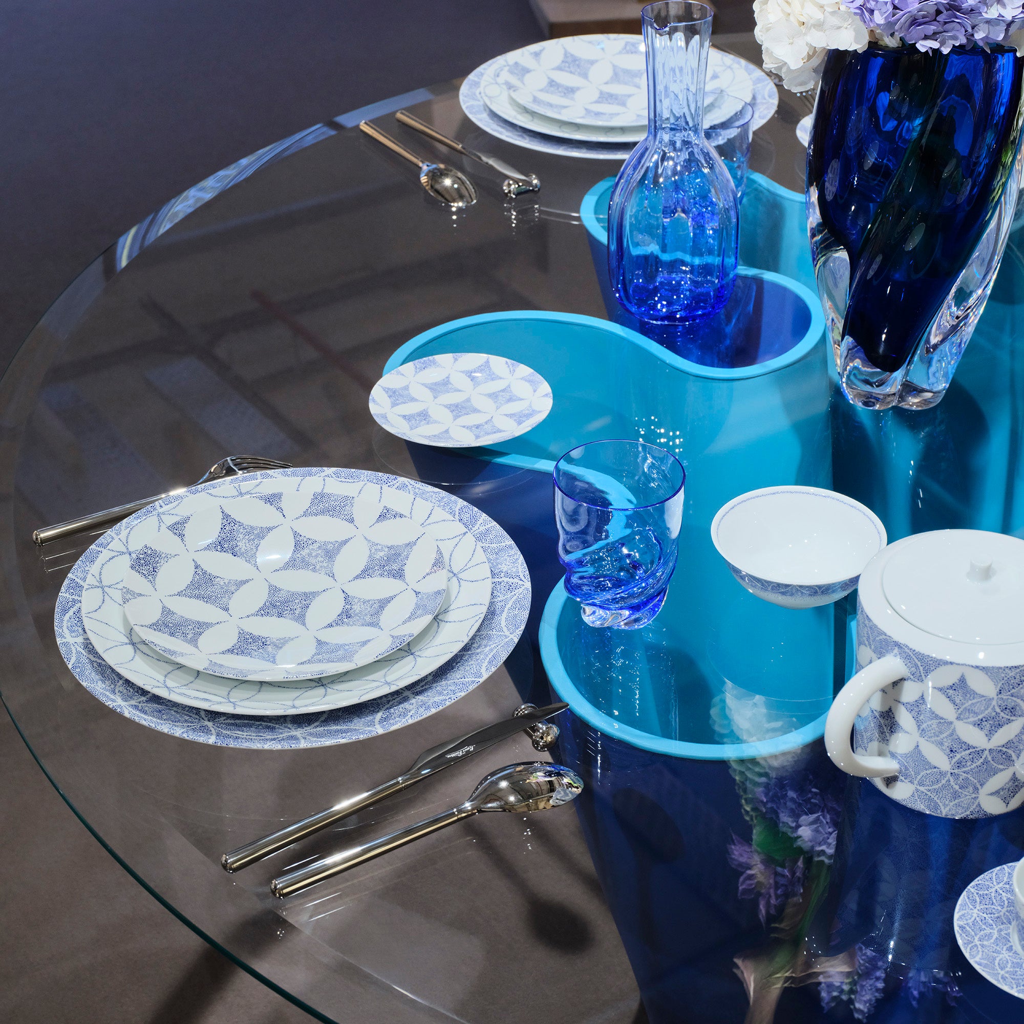 ダイニングテーブルに並んだのは、新たなテーブルウェア·コレクション。磁器セット「コンステラシオン」は、モノグラムにちなんだ楽しくアーティスティックなタッチを添えました。一方、最近ヴォー·ル·ヴィコント城にて発表された、きらめくトロンプ·ルイユ(騙し絵)風の効果を備えたフォーマルなセット「スプランドゥール」は、トランクに伝統的に使用されてきたスタッズのデザインから着想を得たカトラリー·コレクション「リベット」、ムラーノのアトリエにて手吹きされた「ツイスト·グラス」や「フラワー カラフ」と並んで配置されました。