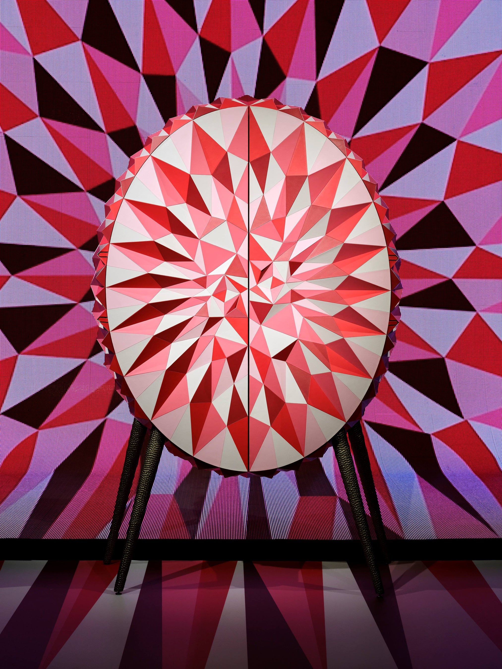 ウンベルト·カンパーナの場合、トランクの魂はこの魅惑的なオブジェとそれを表現した 想像の世界を通じて浮かび上がってきます。「我々の作品はある意味、19世紀のルイ·ヴィトンによる作品の精神を受け継ぎながら、文化を通じた旅を表現している」とデザイナーは続けます。「これらのオブジェに込められた想い出や感情を辿り、そのオブジェが私たちの愛情の受け手となり、世代を超えて次の世代へと受け継がれていくかのように。なので、ルイ·ヴィトンのシグネチャーピースのどれもが、代々受け継がれる家宝のように見えるのも不思議ではない。そしてこれこそが、私たちが実現を目指す感覚」。8点限定で制作された荘厳で優美な「オブジェ·ノマド」の「Kaléidoscope Cabinet」は、レザーの無限の可能性を追求しています。