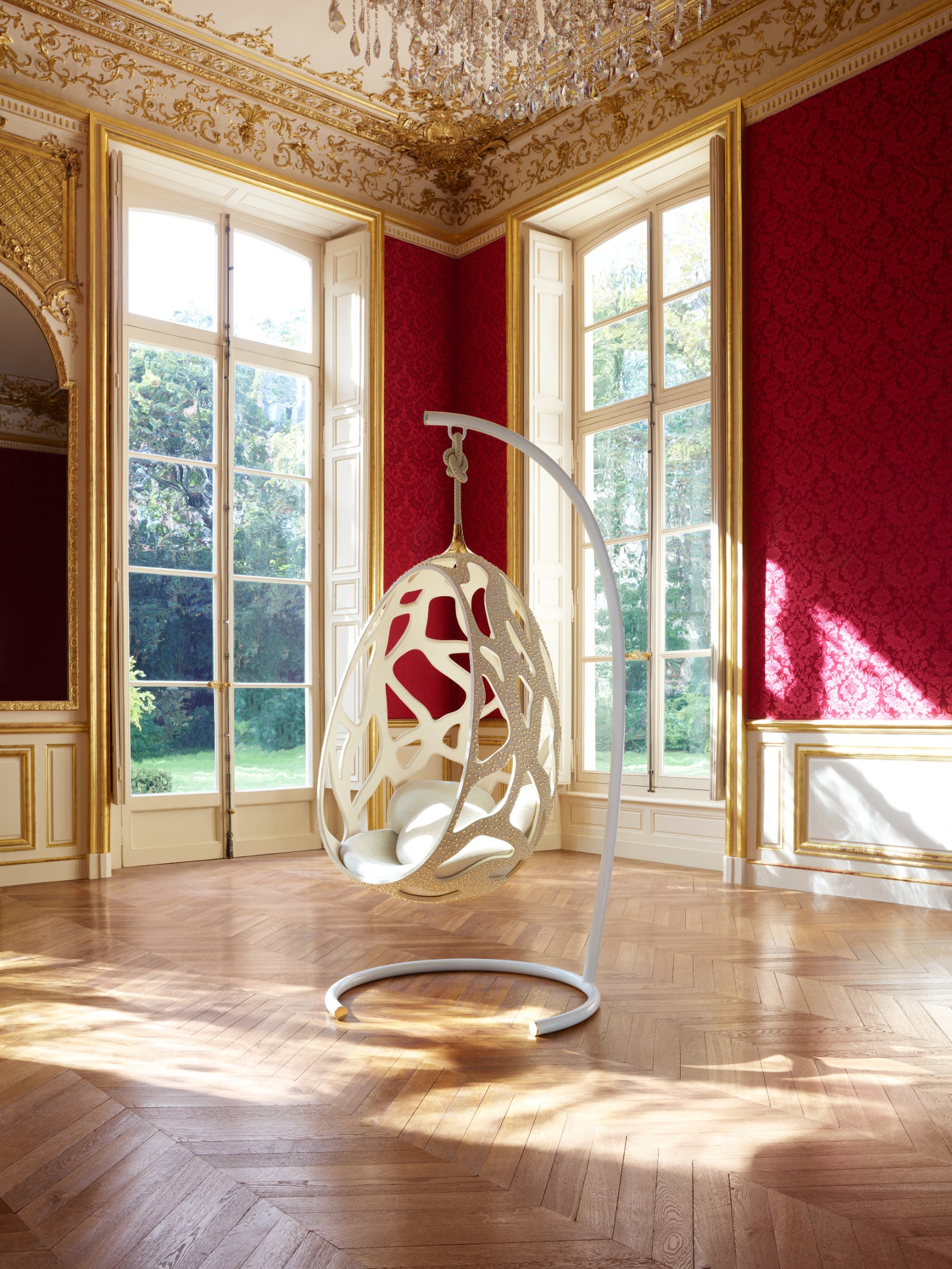これらの並外れた新作のビジョンを実現するために、ウンベルト·カンパーナは、ファッション界で最も名高い芸術工房とのコラボレーションを展開。レザーのシークインやフェザー、ビーズ、金糸刺繍など、それぞれ1点限定で制作されるチェアはいずれも、かつてないほどラグジュアリーな質感を追求しています。その贅沢な質感と洗練された素材がそれぞれのオブジェを、吊り下げる芸術作品へと変えています。