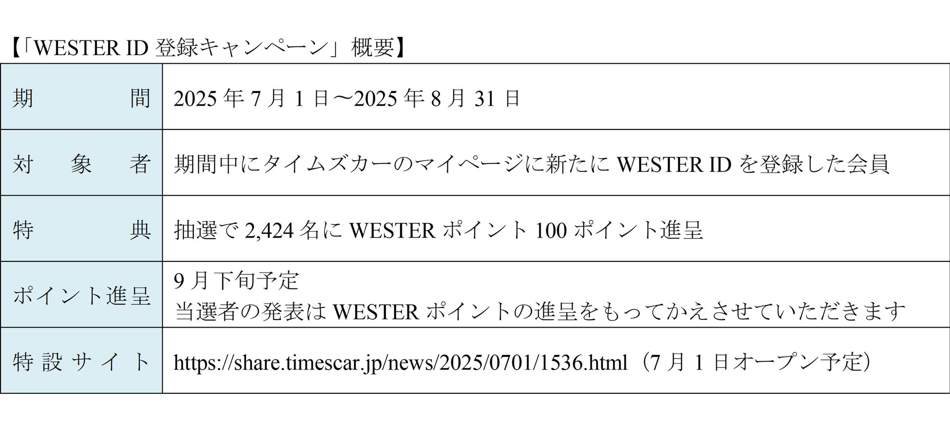 このたび、WESTERポイントを通じてお出かけやお買い物をオトクに楽しんでいただくため、「タイムズカー WESTER ID登録キャンペーン」を実施します。本キャンペーンは、期間中にタイムズカーのマイページでWESTER IDを新規登録した方の中から、抽選で2,424名にWESTERポイント100ポイントを進呈するものです。