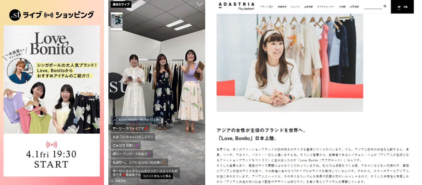 既に先行して、2022年1月に株式会社サンマルクホールディングスの「チョコクロ」や「鎌倉パスタ」の冷凍配送、2022年4月に国内ECサイト初出店となるシンガポール発ブランド「Love, Bonito」の取り扱いがスタートしており、ドットエスティ内のコンテンツ「STAFF BOARD」やライブ配信で、当社の人気スタッフが実際に着用や調理をしながら使用シーンをご提案するなど、単なる商品の販売にとどまらない、ドットエスティならではのユニークな展開を強みとしています。