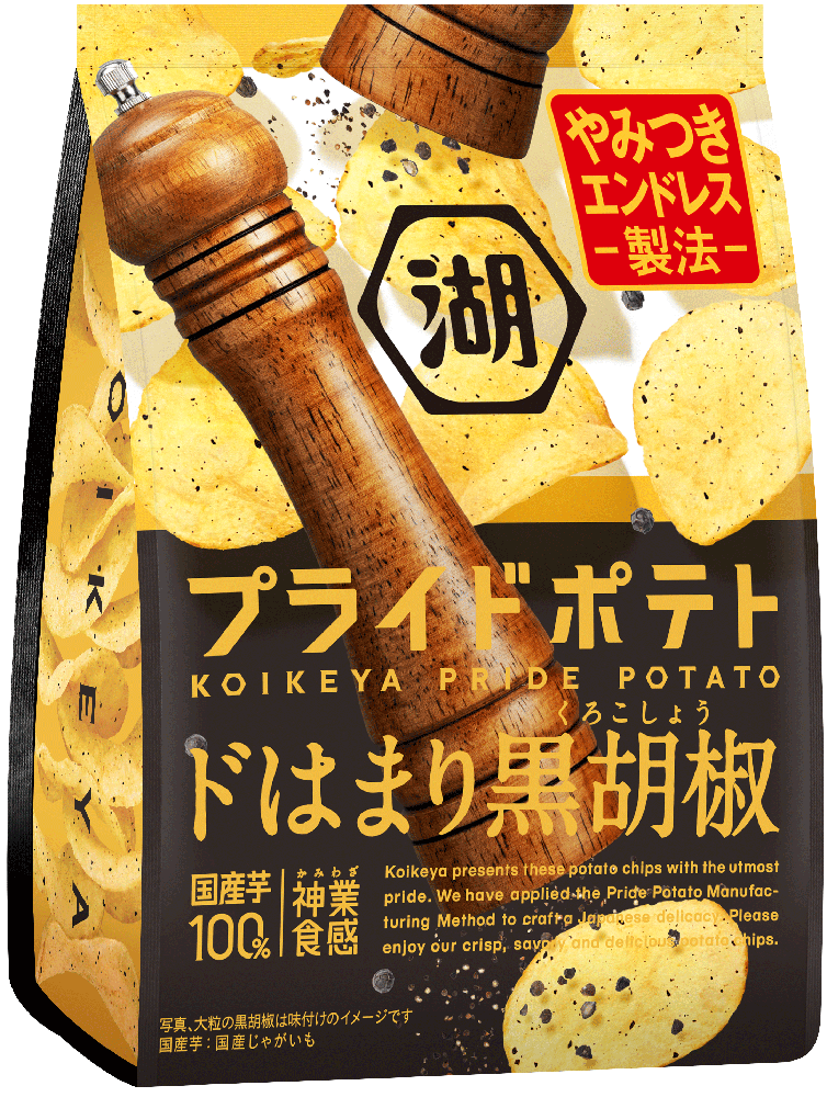 「湖池屋プライドポテト ドはまり黒胡椒」は、これまで定番で展開していた「通の黒胡椒」が進化して生まれた一品。今回のリニューアルでは、より幅広い層の方々に楽しんでもらえるよう、ネーミングとパッケージを変更し、味わいもさらに改良しました。挽きたてのような爽やかな黒胡椒の香りと「やみつきエンドレス製法」による旨みでやみつき感がアップ。大粒の黒胡椒を使用し、見た目の華やかさも加えています。国産じゃがいもの旨みを引き立てる、黒胡椒の爽やかな香りとキレ、隠し味の魚介の旨みが奥深く広がり、やみつきになる一品です。