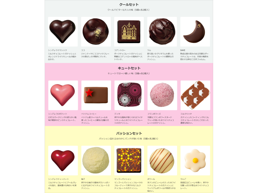 ■クール、キュート、パッションをイメージした15種類のチョコレートを厳選