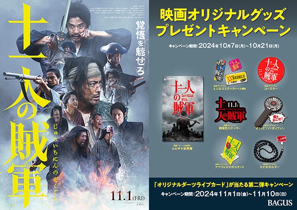 ビリヤードやダーツなどのアミューズメント施設やインターネットカフェなどを展開する「BAGUS」ブランド公式アプリ会員様を対象に、10月7日(月)から映画『十一人の賊軍』公開を記念したプレゼントキャンペーンを実施します。また映画公開日の11月1日が「ダーツの日」にあたることから、映画オリジナルのダーツアイテムが当たるSNSキャンペーンも実施します。さらに期間中はインターネットカフェ店舗にてポスター掲出や予告動画を放映し映画の世界観をお楽しみいただきます。