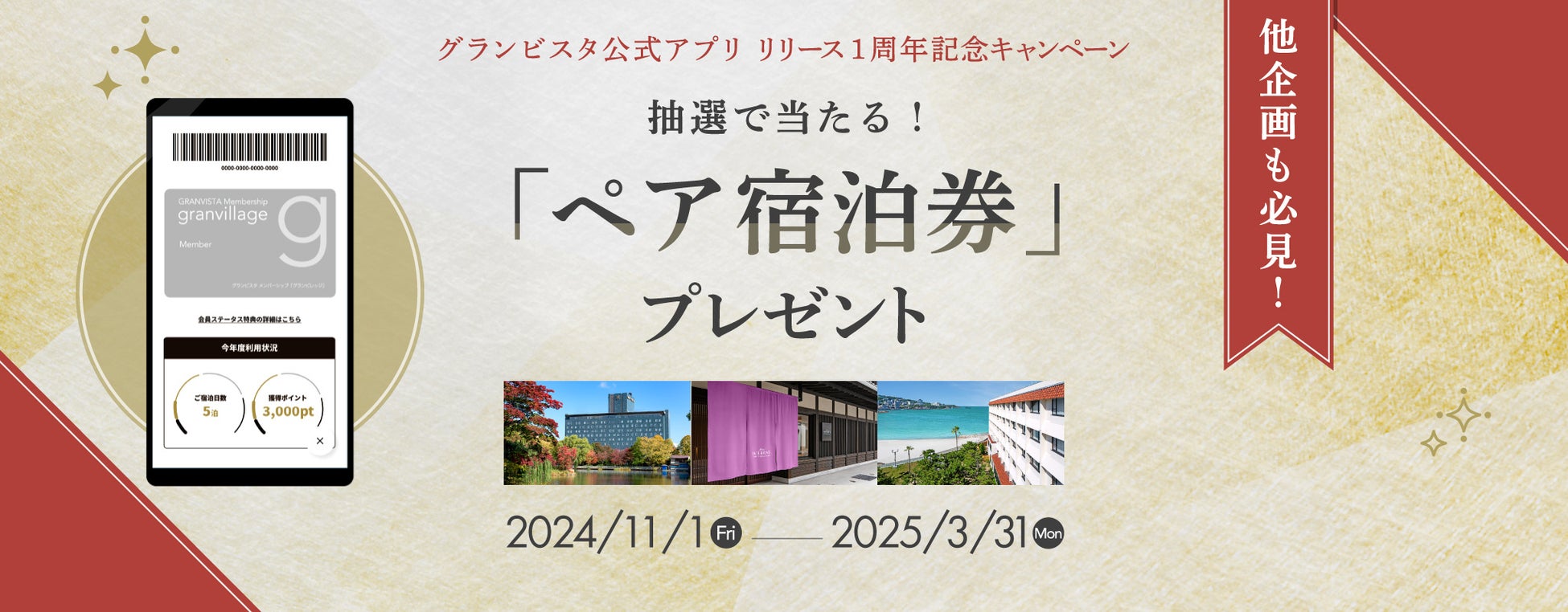 グランビスタ ホテル&リゾートが運営する全国にあるホテルや旅館、レジャー施設をお得にお楽しみいただける、入会金・年会費無料の会員プログラム「グランビレッジ」。その公式アプリが、2024年11月1日にリリースから1周年を迎えたことを記念し、グランビスタ公式アプリ リリース1周年記念キャンペーンを実施いたします。