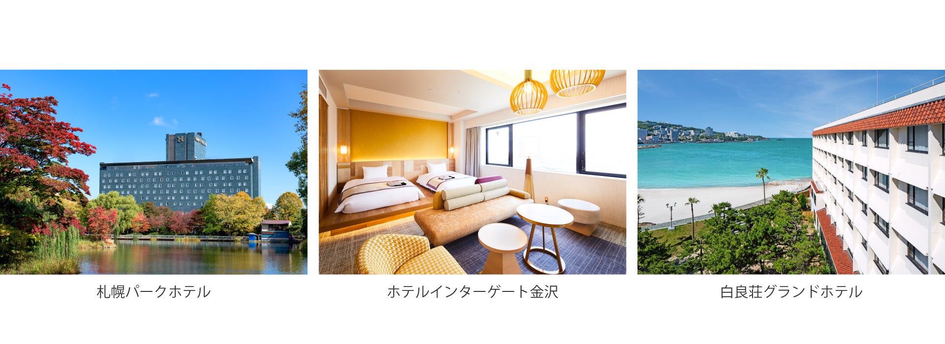 《施設一覧》札幌グランドホテル / 札幌パークホテル / 熊本ホテルキャッスル(提携施設) / ホテルインターゲート京都 四条新町 / ホテルインターゲート東京 京橋 / ホテルインターゲート広島 / ホテルインターゲート金沢 / ホテルインターゲート大阪 梅田 / 銀座グランドホテル / キャプション by Hyatt なんば 大阪 / 京町家 京都二条 さわら木の宿 / 京町家 京都ぎをん 八坂の宿 / 白良荘グランドホテル / ホテルゆもと登別 / 鴨川シーワールド / 鴨川シーワールドホテル / 神戸須磨シーワールド / 神戸須磨シーワールドホテル / 苫小牧ゴルフリゾート72 / 佐野ハイウエイレストラン / 足柄ハイウエイレストラン / 大津ハイウエイレストラン /