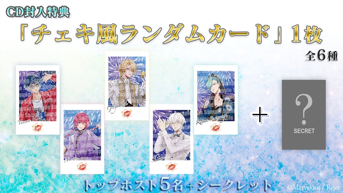 今回の封入特典は「チェキ風ランダムカード」となっており、2023年3月まで開催されていたご指名イベント「ホスト・ロワイヤル2023」で上位を勝ち取ったトップホスト5名の絵柄と、加えて1種の「シークレット」