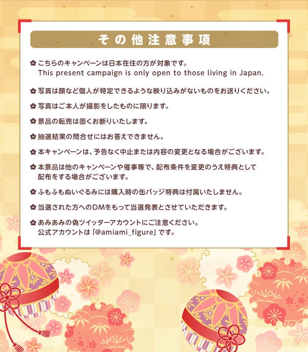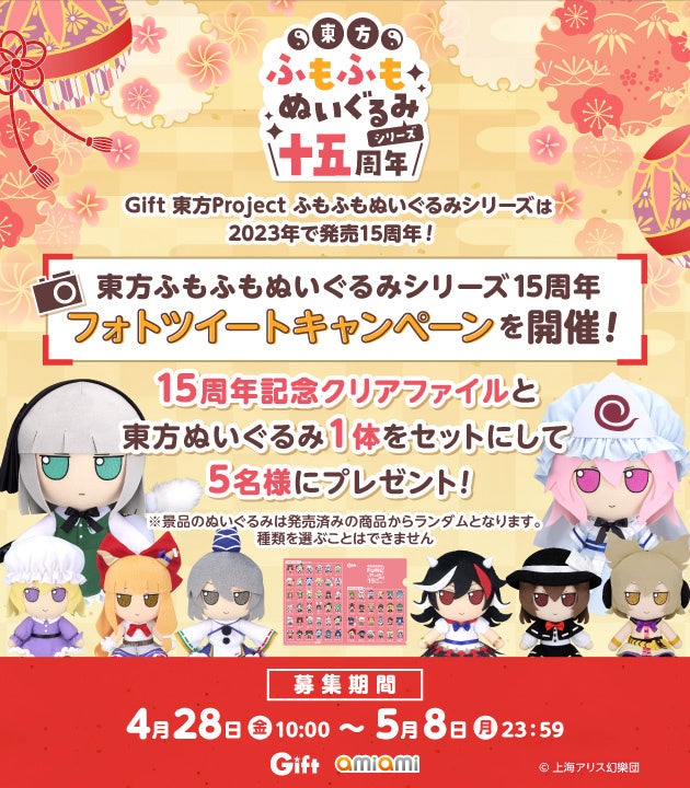 - あみあみ本店のTwitterアカウント(@amiami_figure)をフォロー、お手元にある「Gift 東方ふもふもぬいぐるみシリーズ」を撮影し、「#東方ふも15thフォト」をつけてツイート!抽選で5名様に、「15周年記念クリアファイル」と「東方ぬいぐみ」1体をセットにしてをプレゼント。